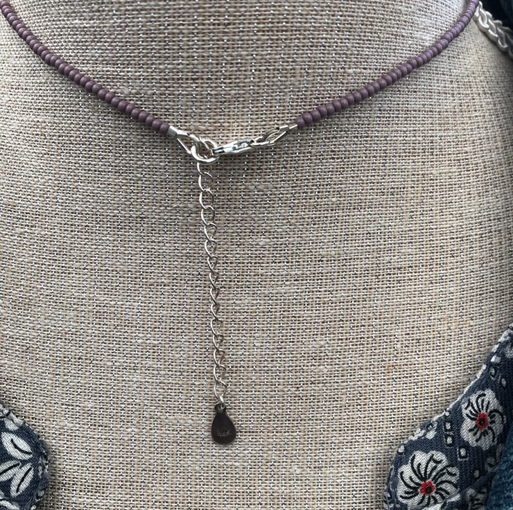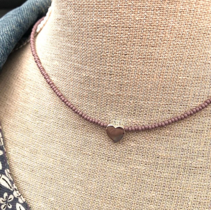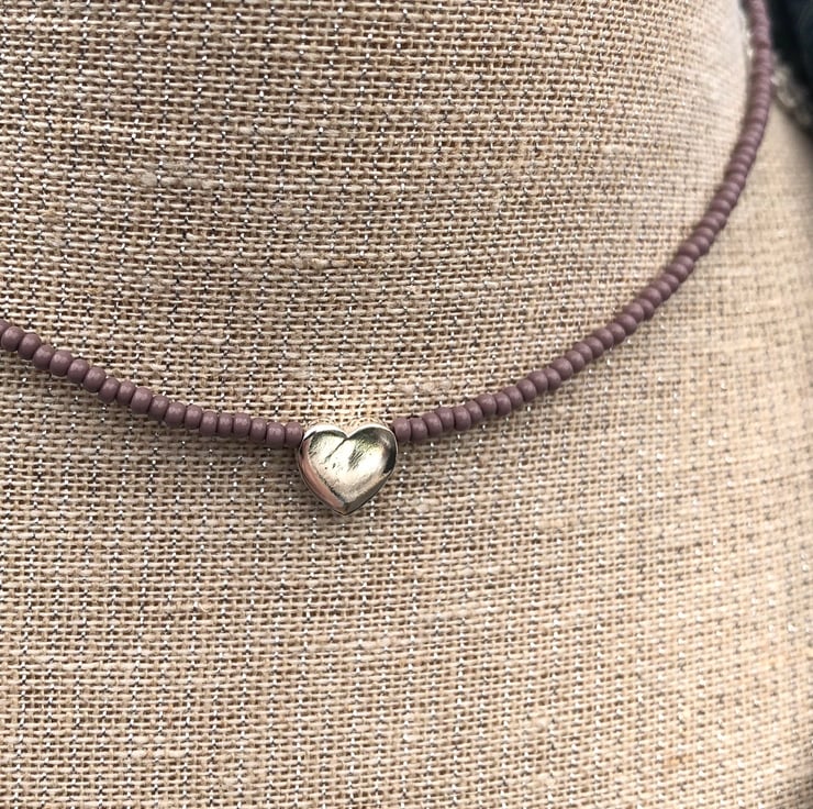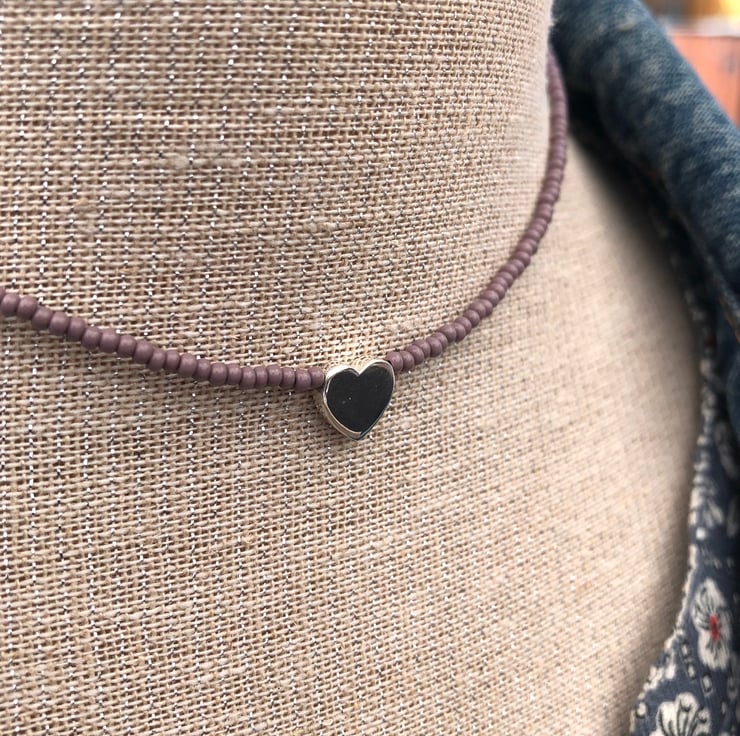 This light weight choker has been lovingly handmade using Czech glass seed beads and a sterling silver hollow heart.