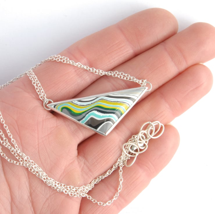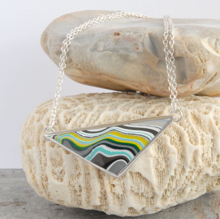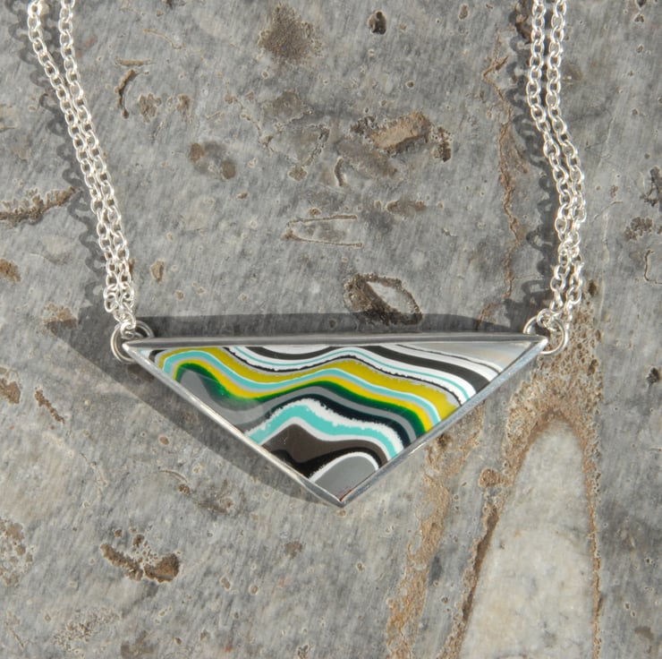 This geometric necklace is sure to catch the eye with it's angular triangular shape juxtaposing with the rippling bands of colour in the boatite. The colour palette of the boatite features deep emerald green, turquoise and chartreuse green on a back ground of white, greys and black. The boatite is suspended in the middle of a doubled sterling silver chain and has an extender chain for adjustability. The boatite is approx 1 3/4 inches by 3/4 inch (42mm by 18mm), the total length (excluding the extender) is almost 18 inches but it sits like a slightly shorter necklace due to the rigid part. The extender is a further 2 inches. Comes gift boxed.