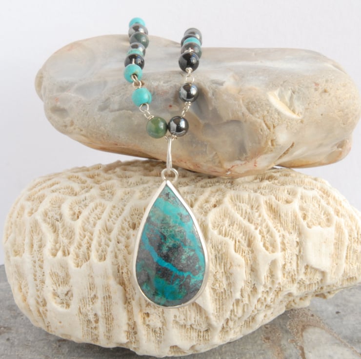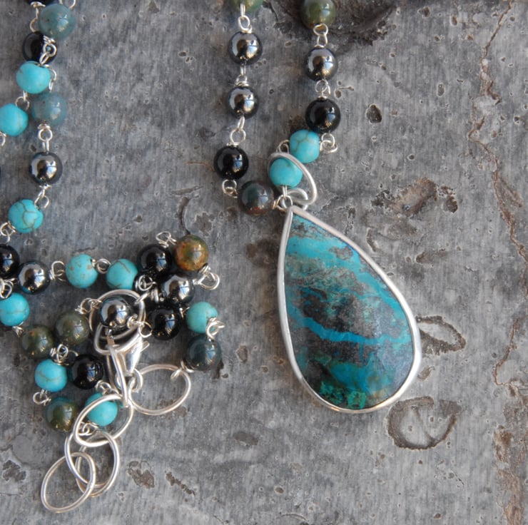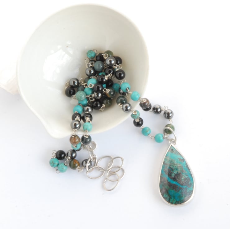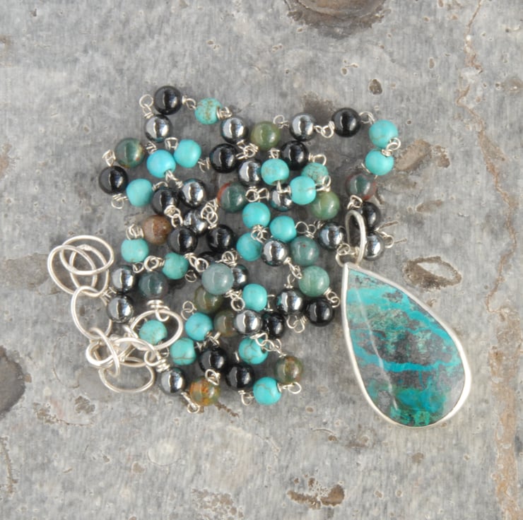 This beaded necklace and pendant set comprises of a drop shaped chrysocolla cabochon bezel set in sterling silver and a strand of beads in coordinating colours. The beads are individually rosary linked using sterling silver wire and comprises of black onyx, gun metal grey haematite, turquoise and green bloodstone to pick up the colours of the chrysocolla which has veins of blue and green running through a black and dark grey matrix. The generous bail on the pendant means it can be carefully slipped over the beads for you to then thread onto a chain or ribbon if you wanted to. The beads are 4mm in diameter as a guide to the size of chain or thong it would fit on, if you would like me to find a chain/thong/ribbon to go with it please drop me a message and we can discuss options and costs.
