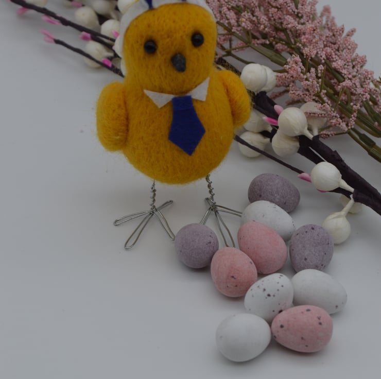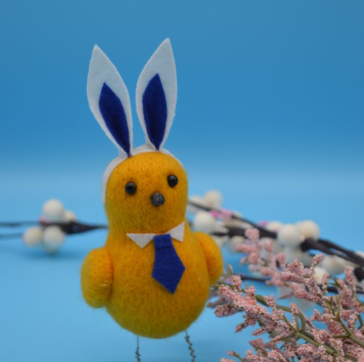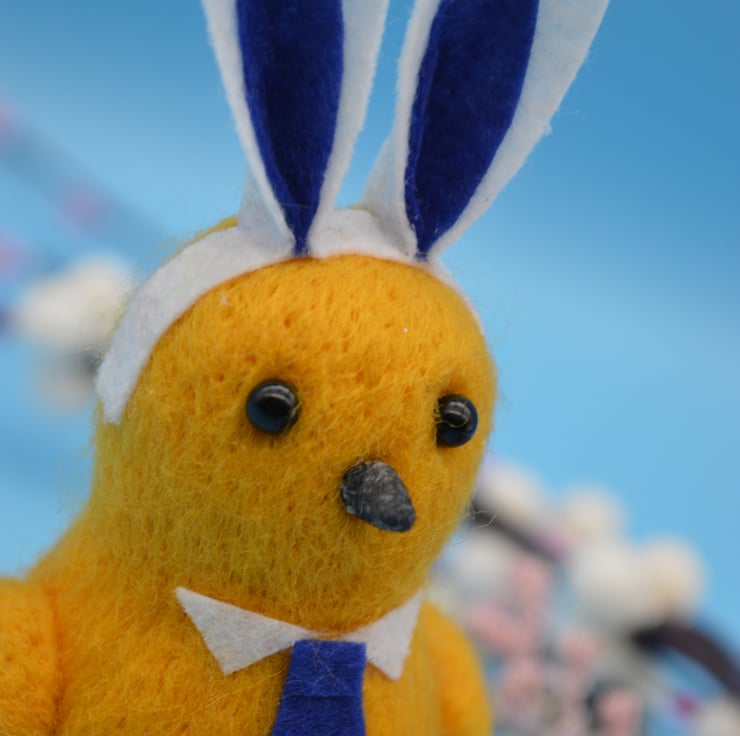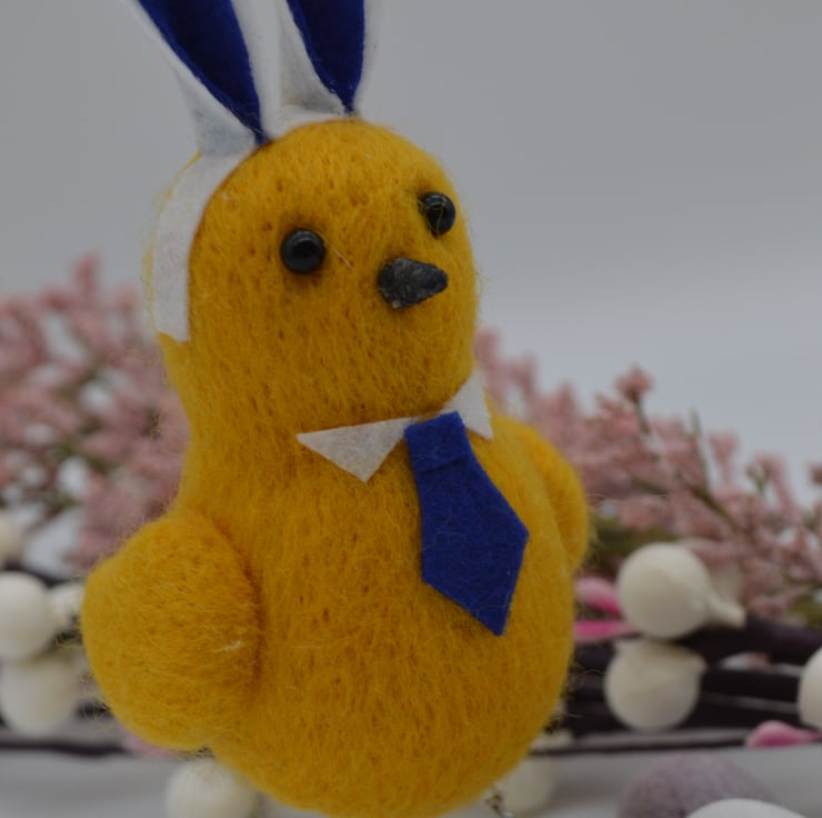 Made from Romney Marsh and Corriedale wool. He has glass eyes and metal legs, a deep blue tie and felt white and blue bunny ears.