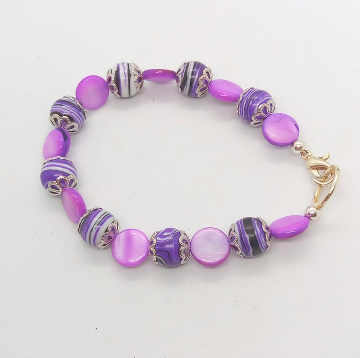 This jewellery set is made using 8 mm flat purple mother of pearl disc beads and 10 mm round semi precious purple agate beads with silver plated bead caps. The necklace and bracelet have silver plated lobster clasps and the earrings have silver plated studs.