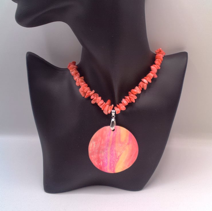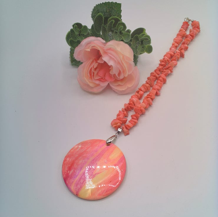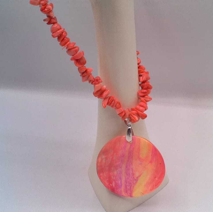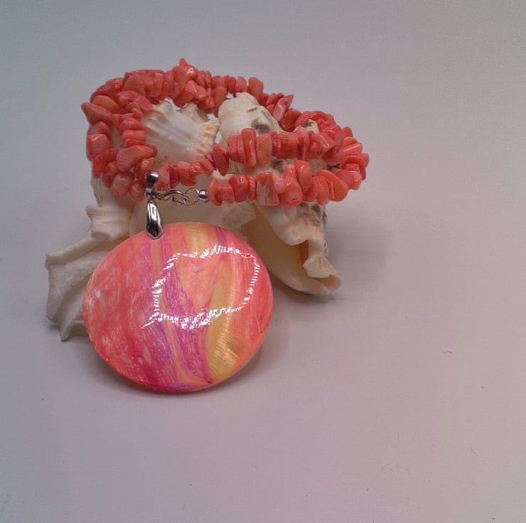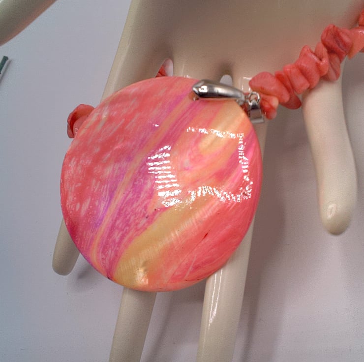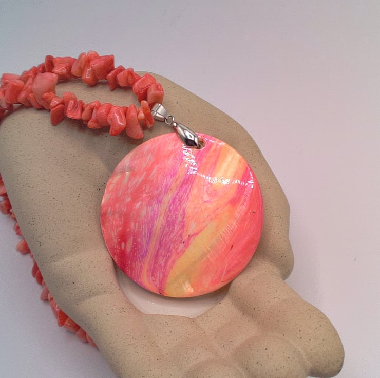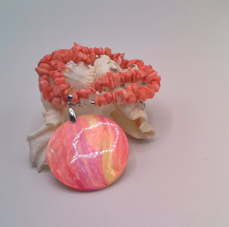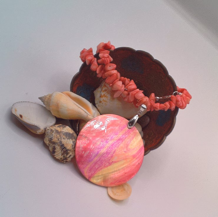 This stunning necklace will put the finishing touches to any outfit for everyday wear or an evening get together with friends. It would also make a lovely gift for a friend or relative for a birthday, anniversary or Mother's day, or a lovely treat for yourself. The stunning pink and yellow shell disc pendant measures 55 mm. It is suspended on a necklace made with pink crushed shell chips and is fastened with a silver plated lobster clasp. The necklace is 16 inches (41 cm) in length. The necklace will be dispatched wrapped in tissue paper in an organza bag and delivered to you via Royal Mail first class post.