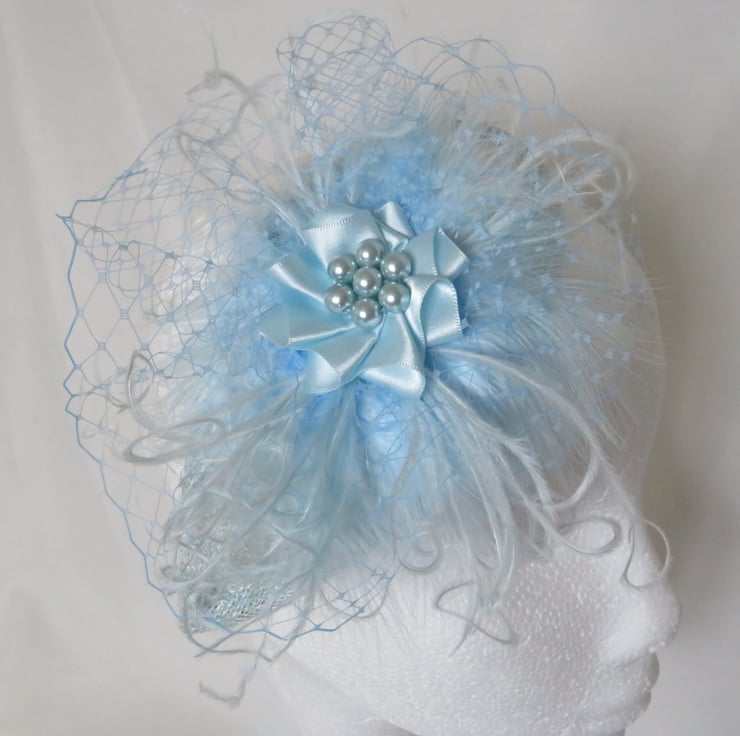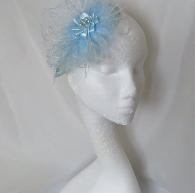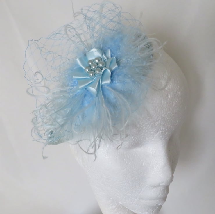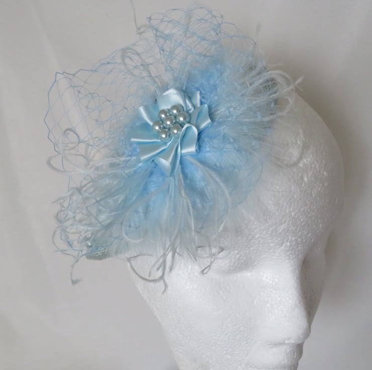 Created with pale blue fluff feathers , a gathered choux of pale blue classic veiling, curled pale blue floaty ostrich feather fronds.