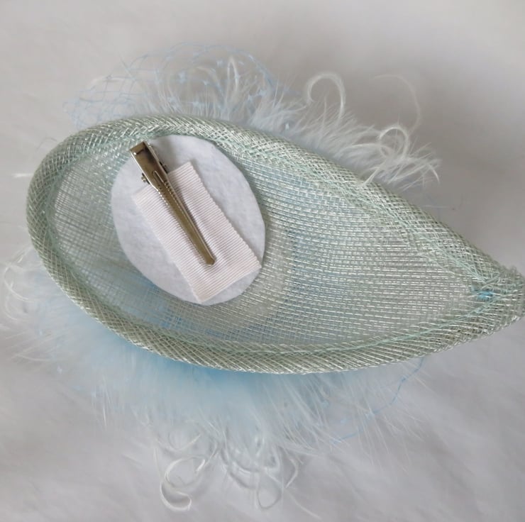 Made on a pale blue teardrop sinamay base, which has white felt and a metal croc clip underneath for fixing.