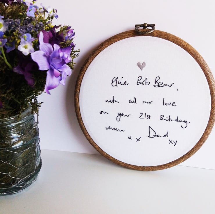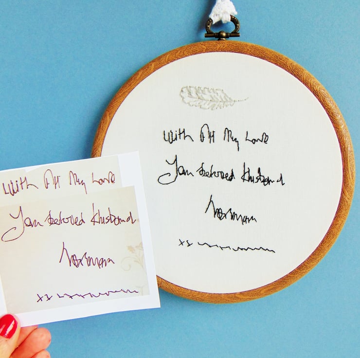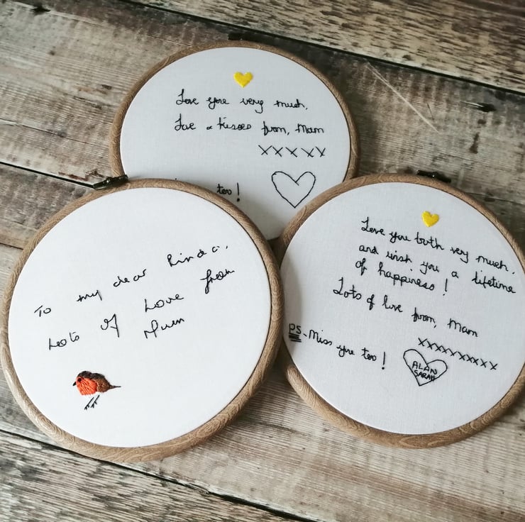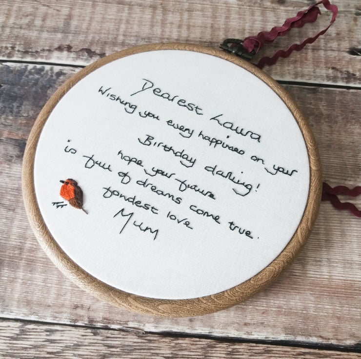 My very popular and extremely special memorial handwriting hoops are now available here on Folksy. If you have a card, note, letter or something else with a late loved ones handwriting on I can transform it into a hand stitched hoop. These are 6 inch hoop size, sewn in black thread and onto white fabric. Please email me a picture of the handwriting either before or after ordering. I can combine handwriting from different cards if required and add an extra motif such as a robin or feather.