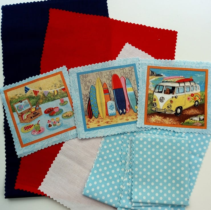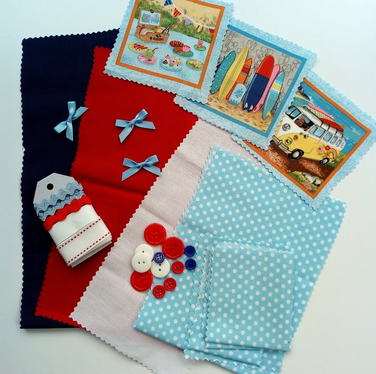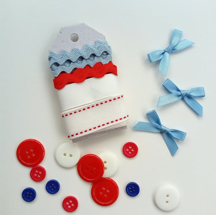 Ribbons, bows, buttons and ric rac, mix and match with the red, white and blue fabrics , which in turn co-ordinate perfectly with the three beach themed fabric squares.