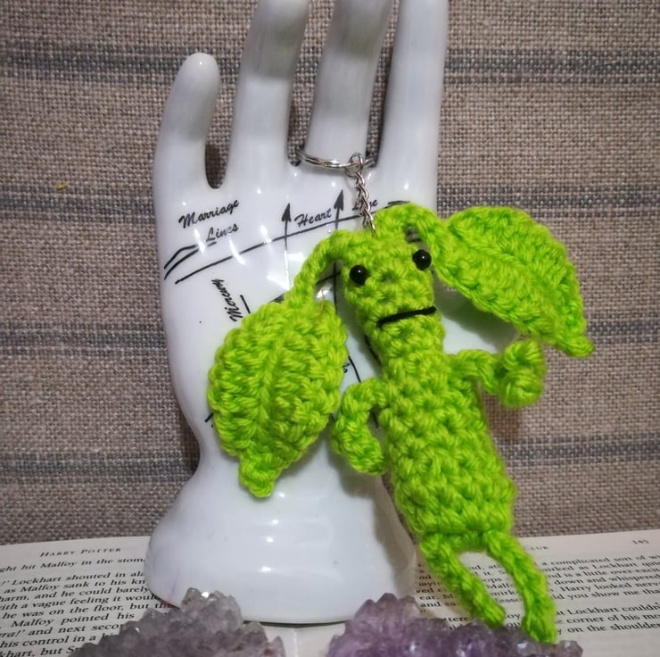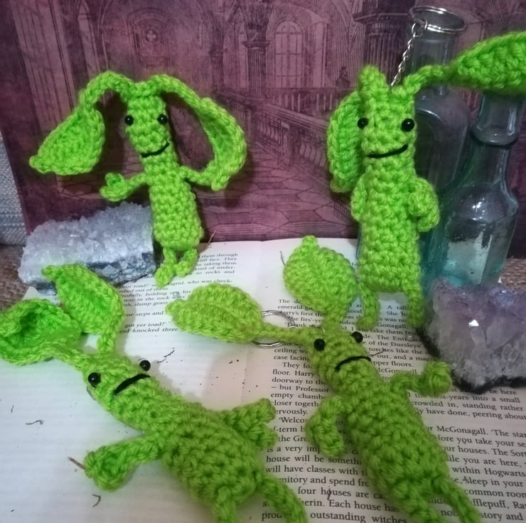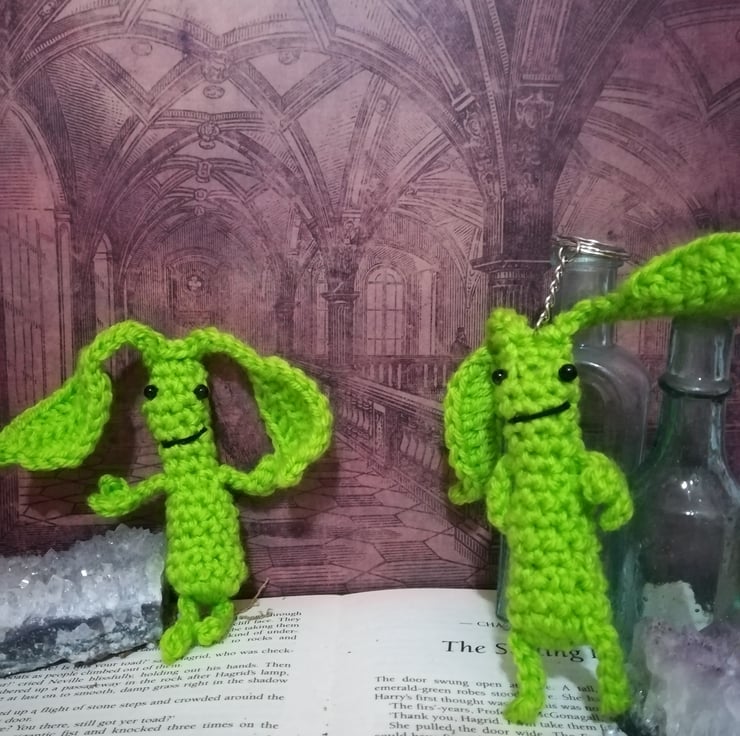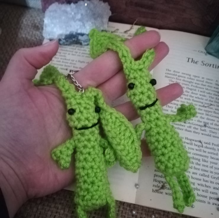 These cute little bowtruckle keyrings measure about 7 by 1 inches and a are made of a lime green yarn.