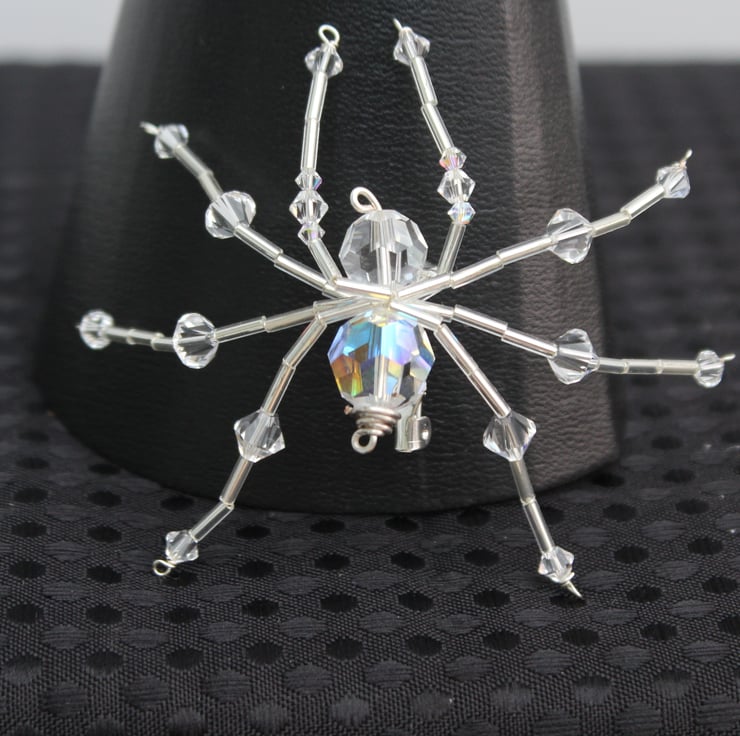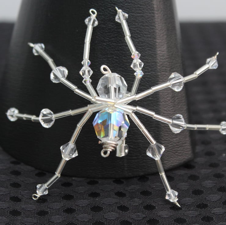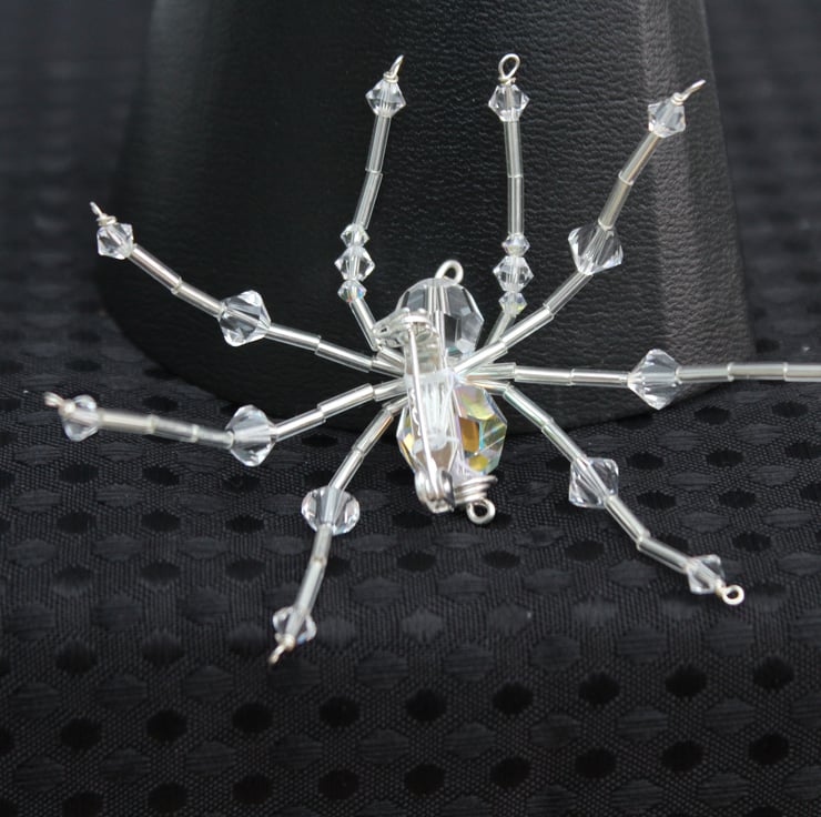 Spider charm Swarovski elements crystal brooch size width approximately 10cm length approximately 8 cm with 12 mm Swarovski ab crystal body and 10 mm clear Swarovski head with 4 mm and 6 mm crystals on legs complete with brooch pin will come gift wrapped