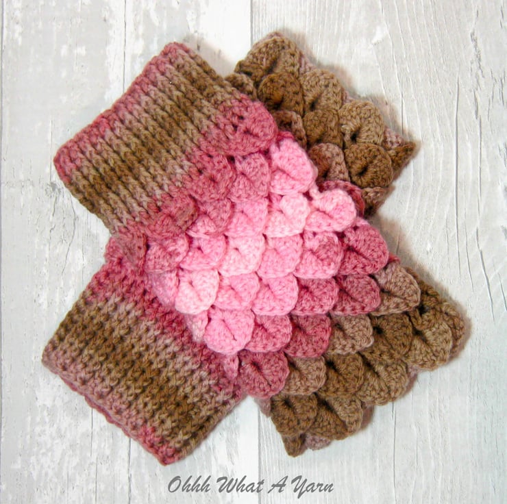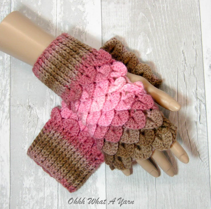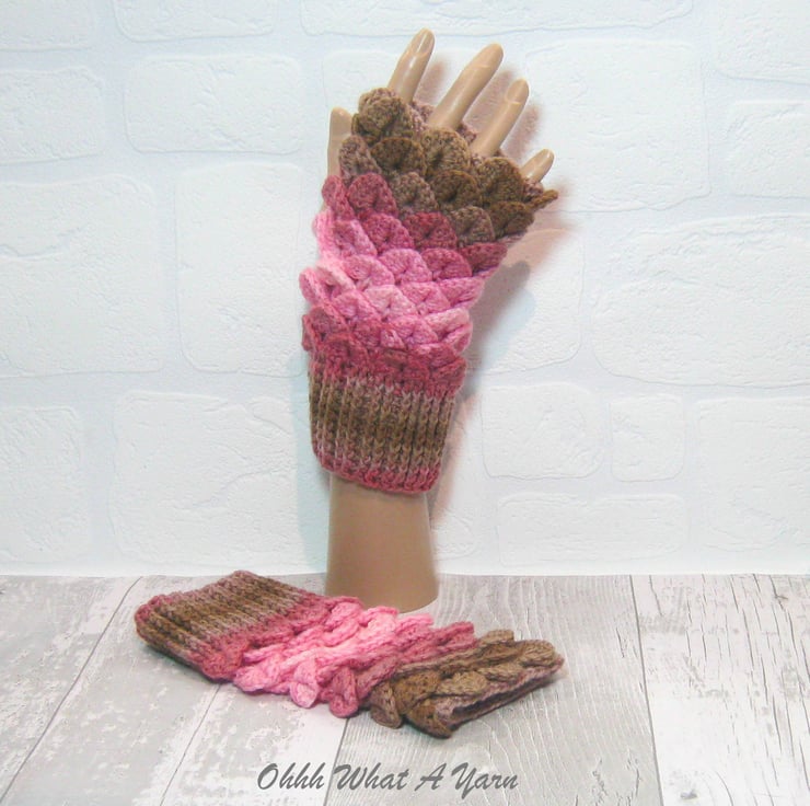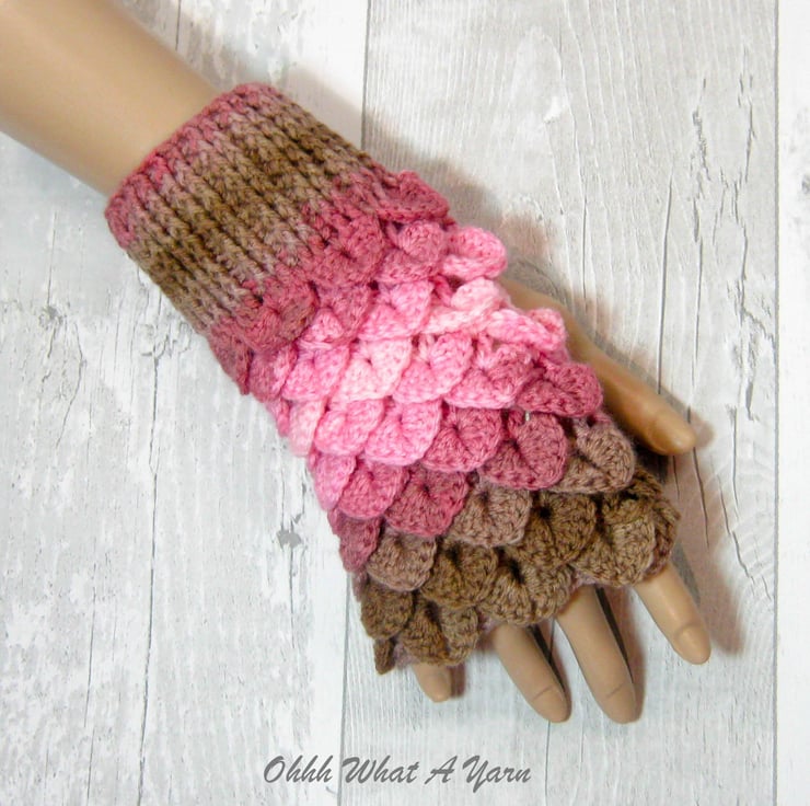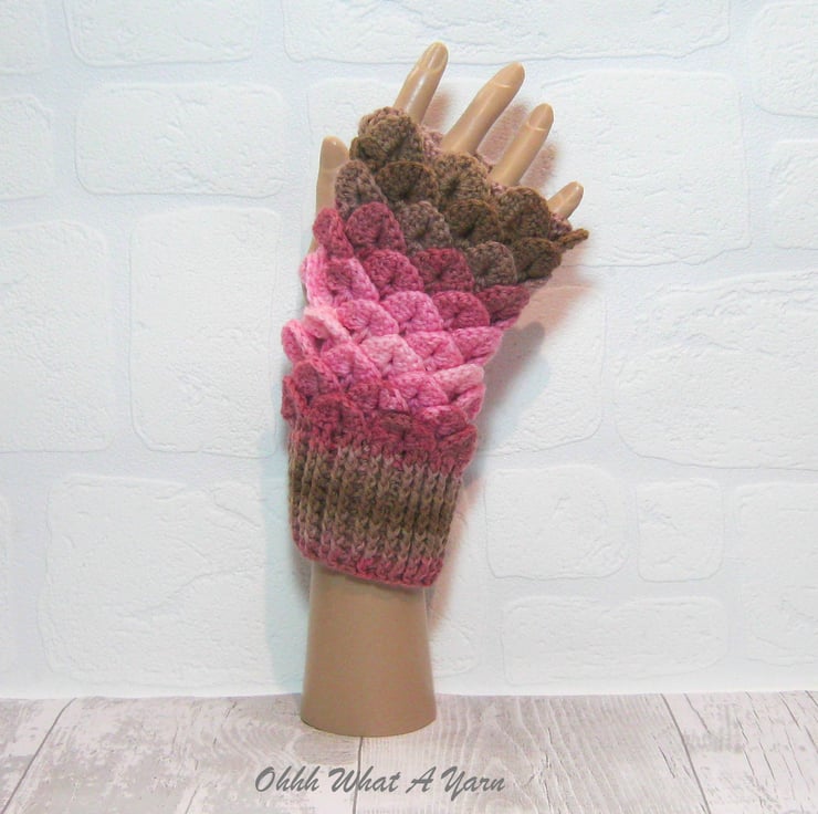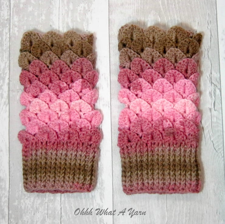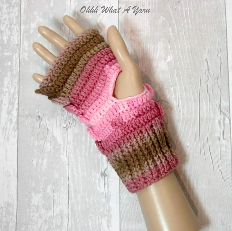 These cosy ladies fingerless gloves have been crocheted using a gorgeous colour changing yarn in beautiful shades of pinks and browns. The yarn is 100% acrylic.