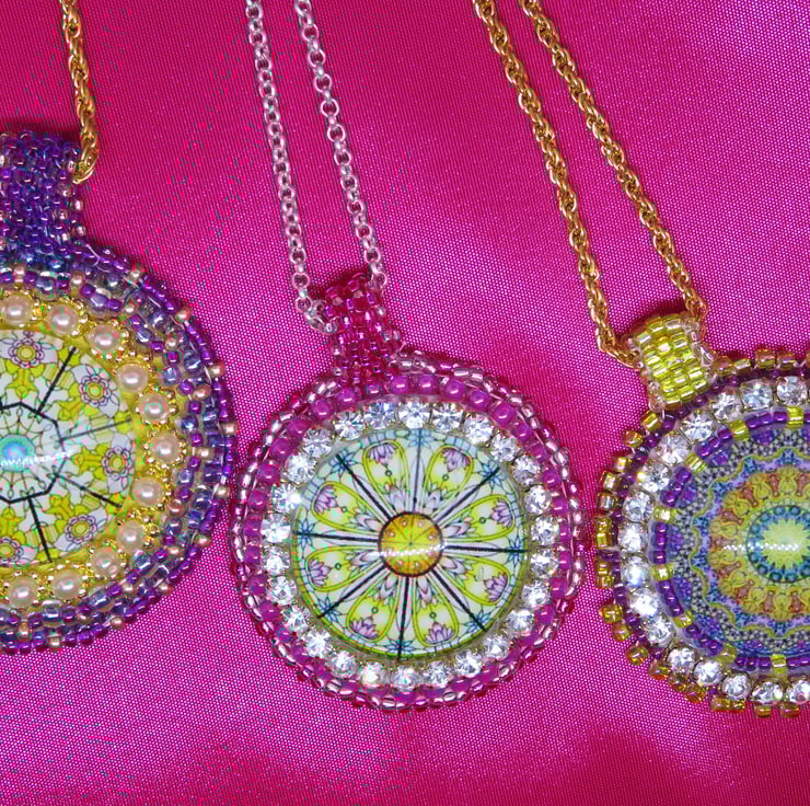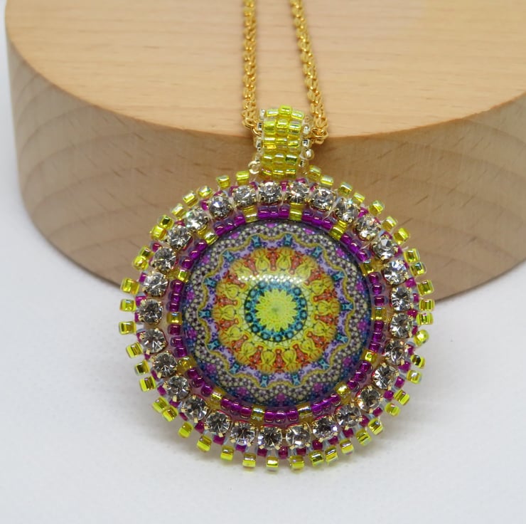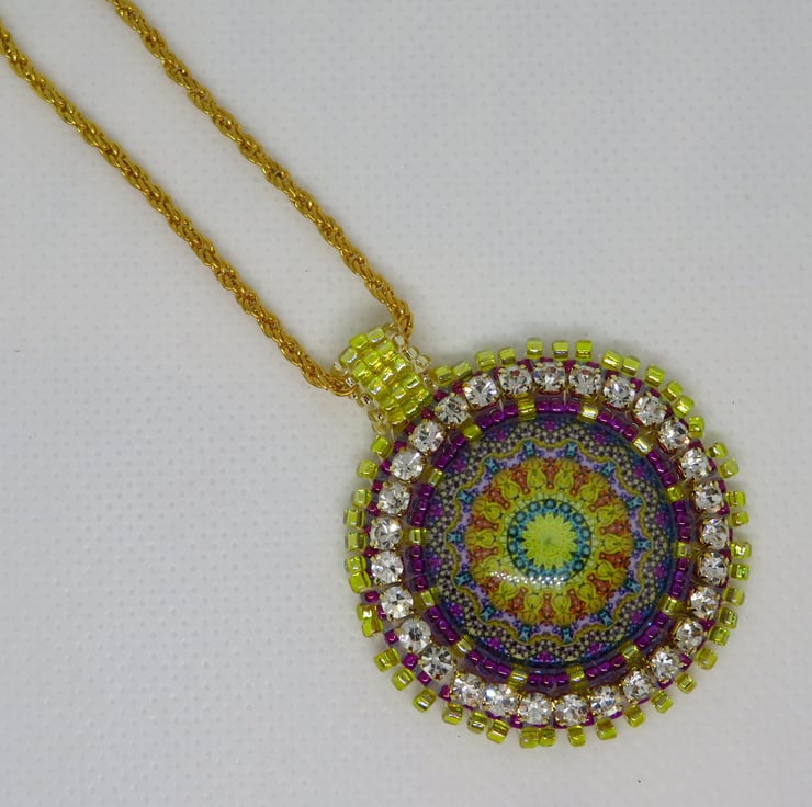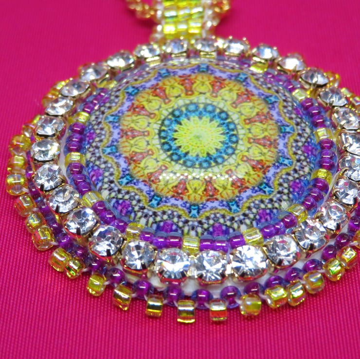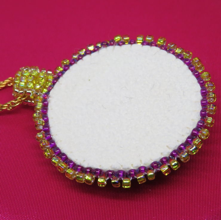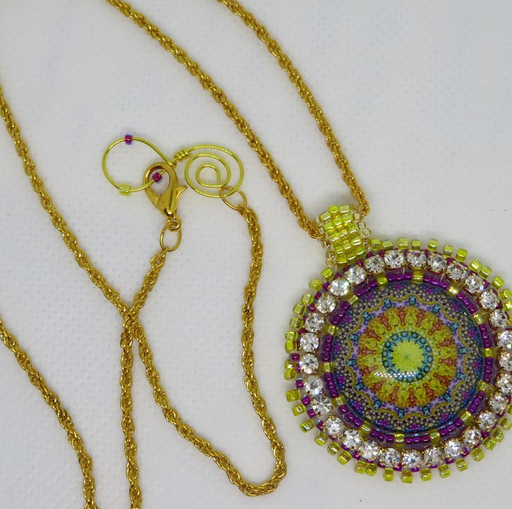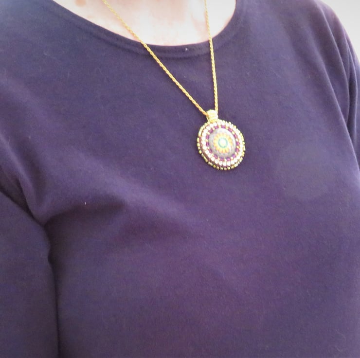 Jewel tones abound in this lovely pendant with a focal jewel themed cabochon. This central mandala is surrounded by bead embroidery using seed beads in purple and gold and diamante. There is a picot edging and a handmade beaded bail. The pendant is backed with cream ultrasuede which is soft against the skin. This pendant hangs from a sturdy gold plated chain and my spiral logo forms part of the fastening together with a simple lobster clasp.