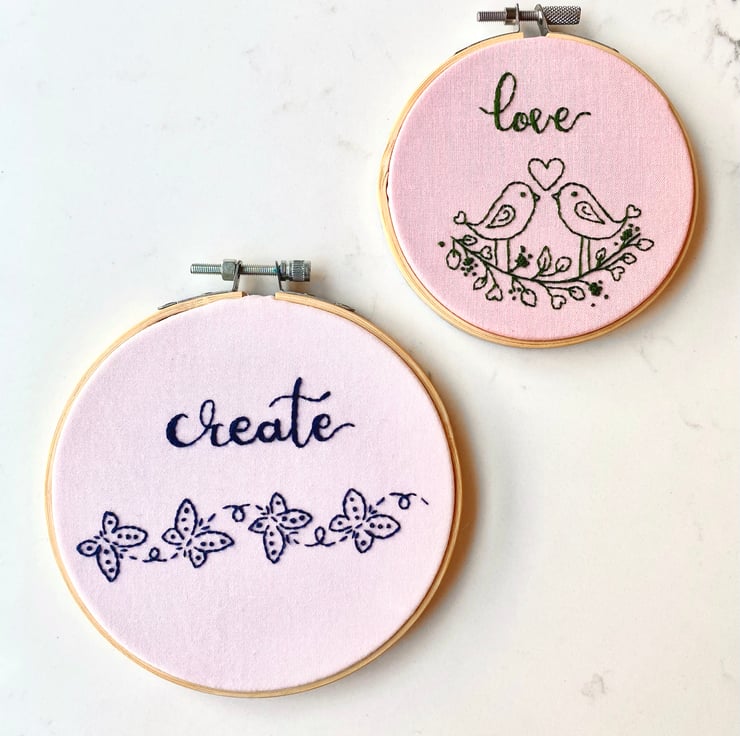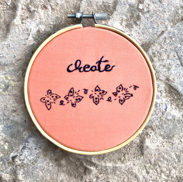 Hand embroidered hoop art featuring the word 'Create' with butterflies underneath.