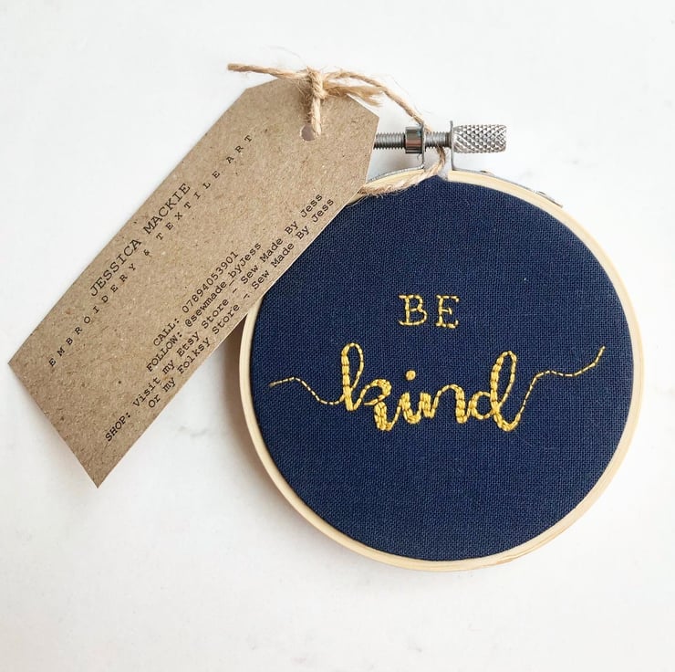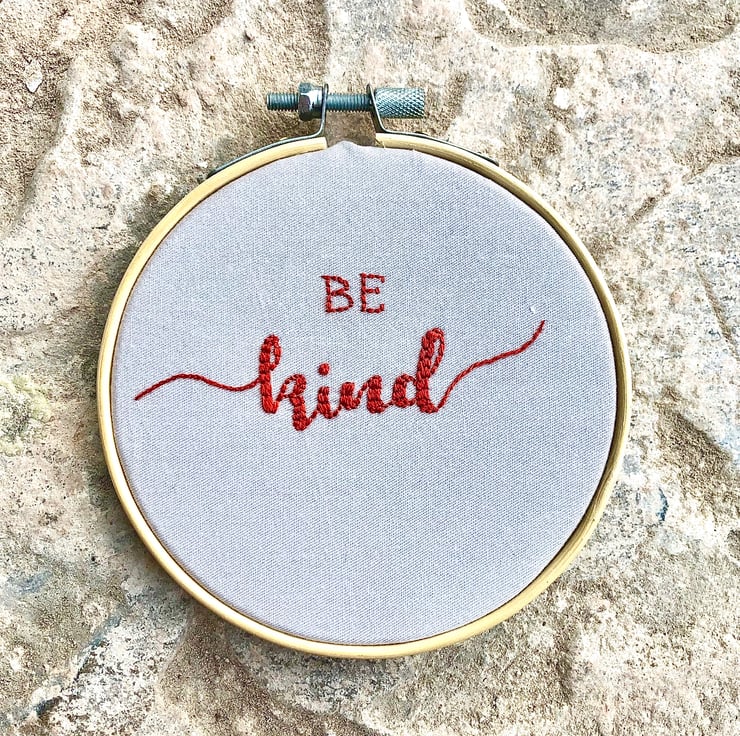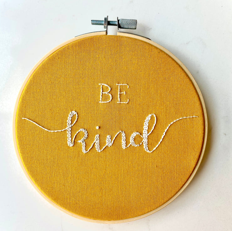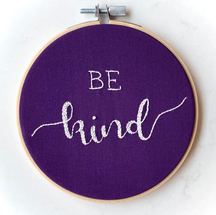 Hand embroidered hoop art featuring the words "Be Kind".