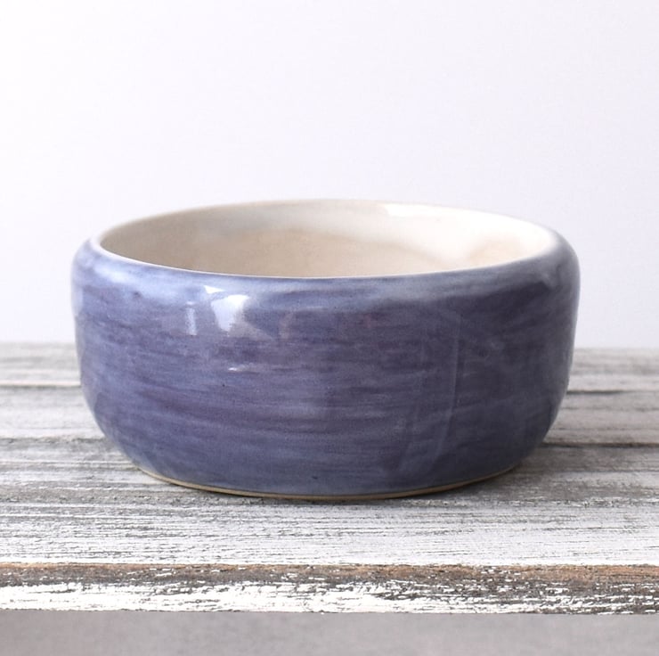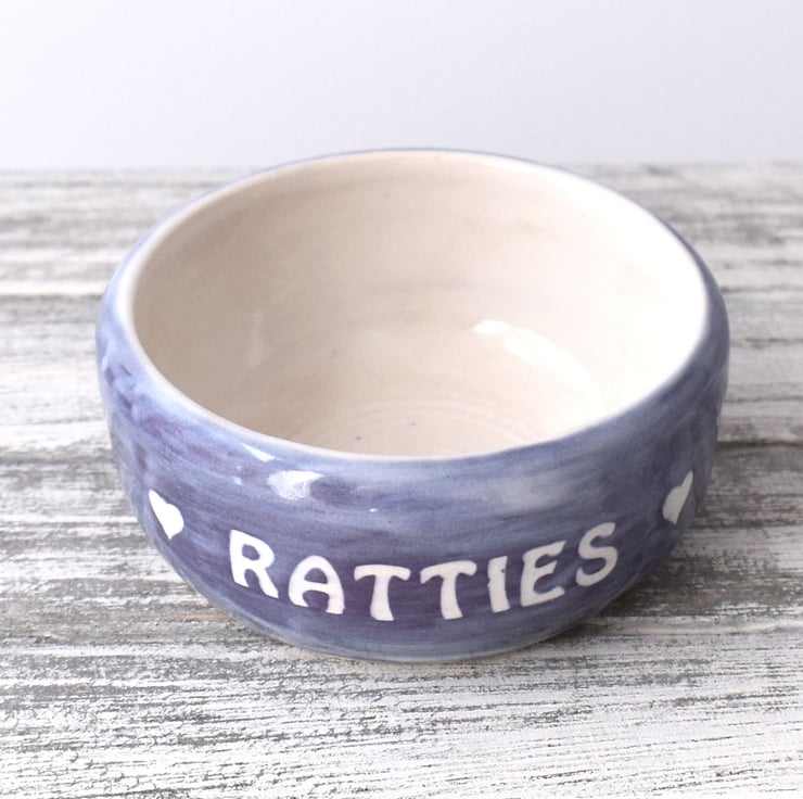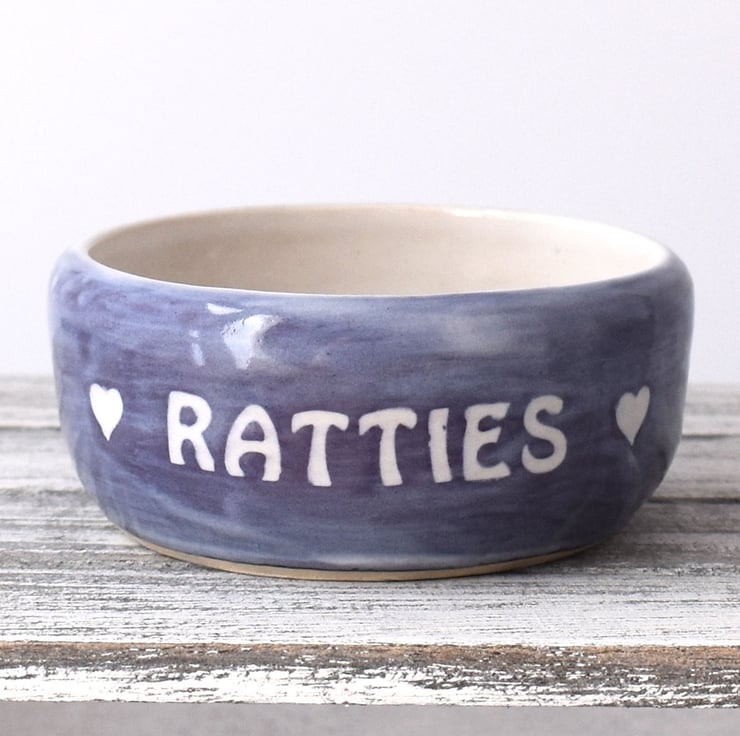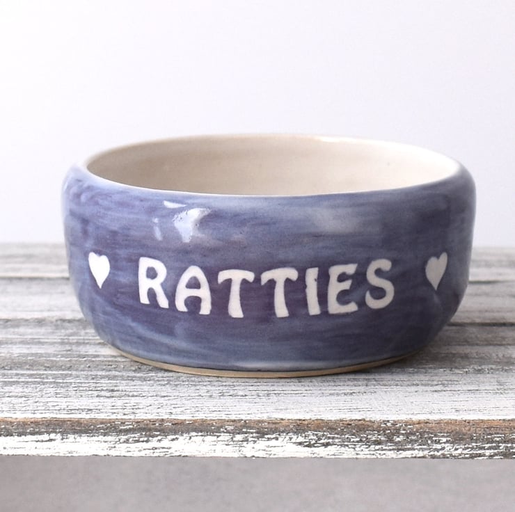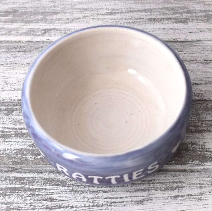 Wheel thrown handmade pottery pet rat bowl with 'RATTIES' on the outside.