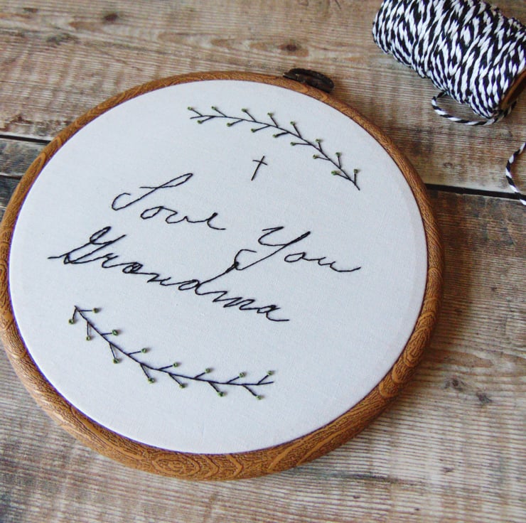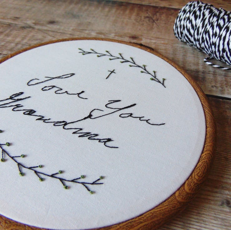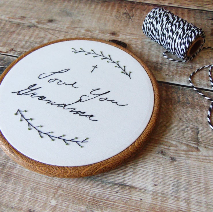 These are my ever so popular actual handwriting hoops with floral border. If you have a card, note or something else with a late loved ones handwriting on, I can transform it into a hand stitched hoop. These also feature a border at the top and bottom of the hoop which can be sewn in any colour. Please send me a picture of the handwriting (I can also combine handwriting from different sources), email the flossystitch (at sign) gmail.com either before or after you place your order. The handwriting will be black text onto white cotton and set in a six inch hoop.