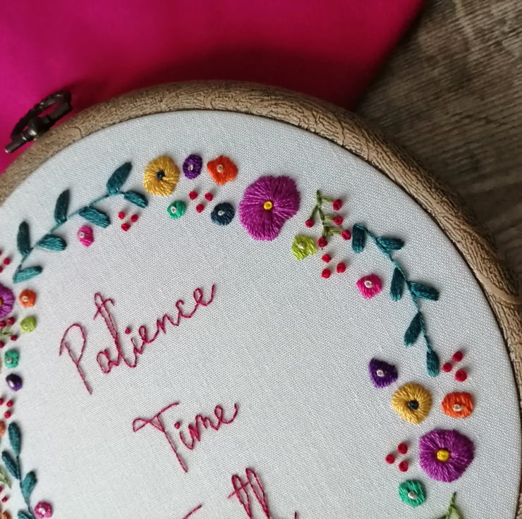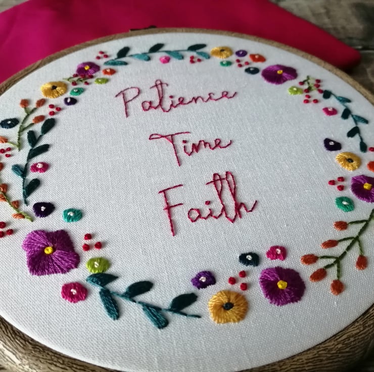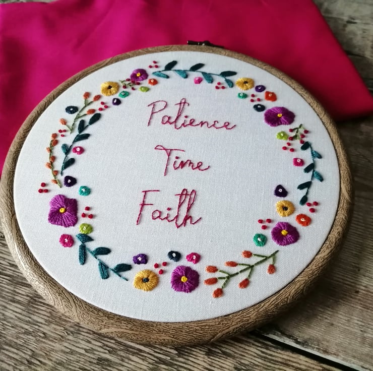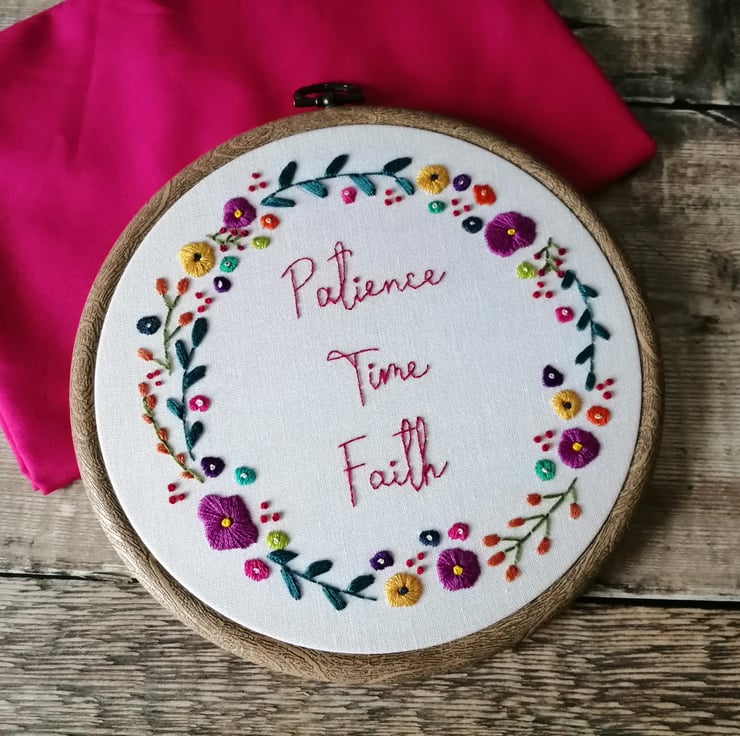 A gorgeous hand stitched 'Patience Time & Faith' hoop featuring an amazing floral wreath sewn in a multitude of jewel colours. This beautiful design is handmade to order, sewn onto white cotton and set in a six inch hoop.