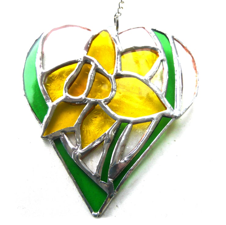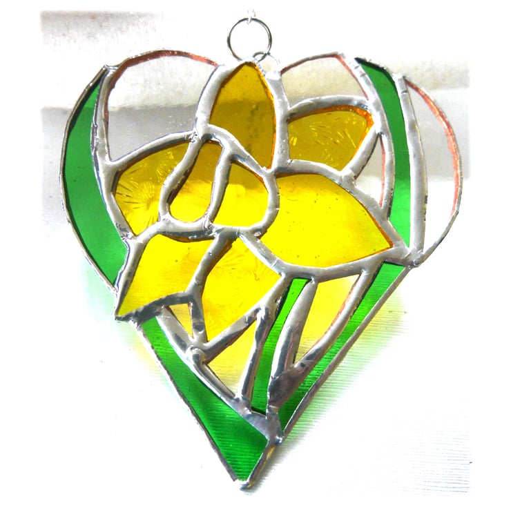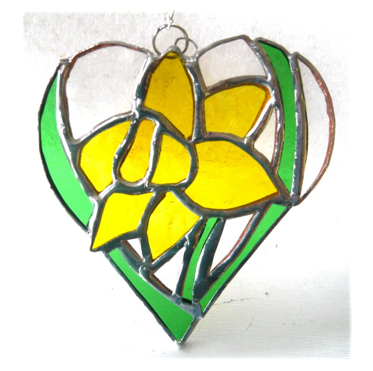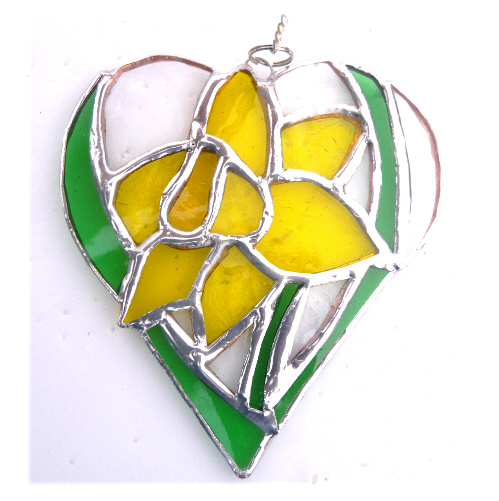 One of my flower heart range. A daffodil, bright yellow with strappy green leaves. The flower is enclosed in a heart shape with the surrounding glass in clear, gently textured glass.