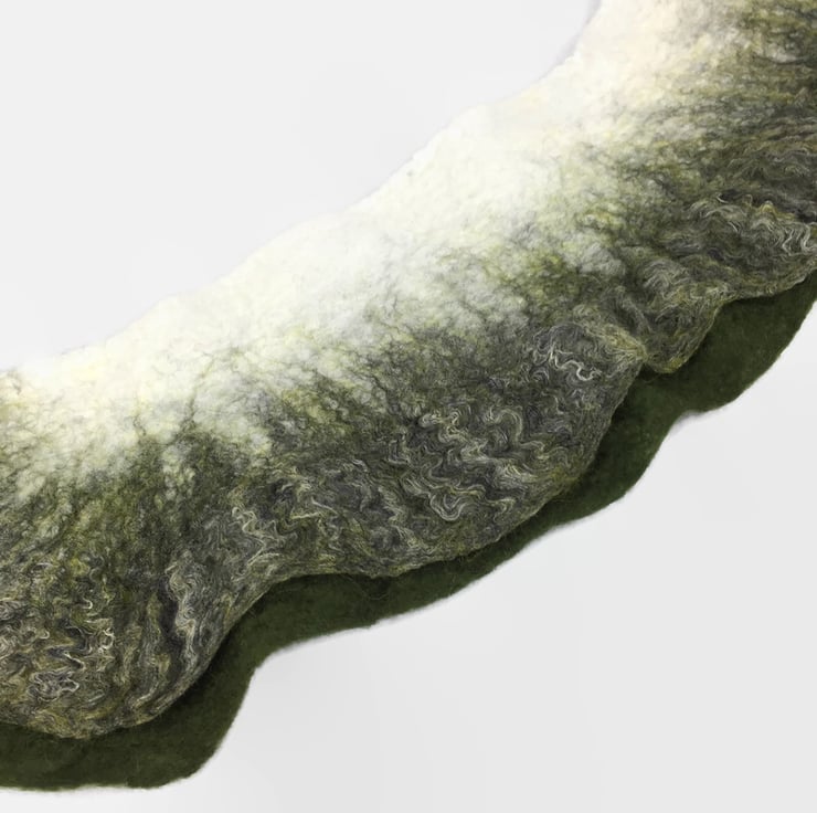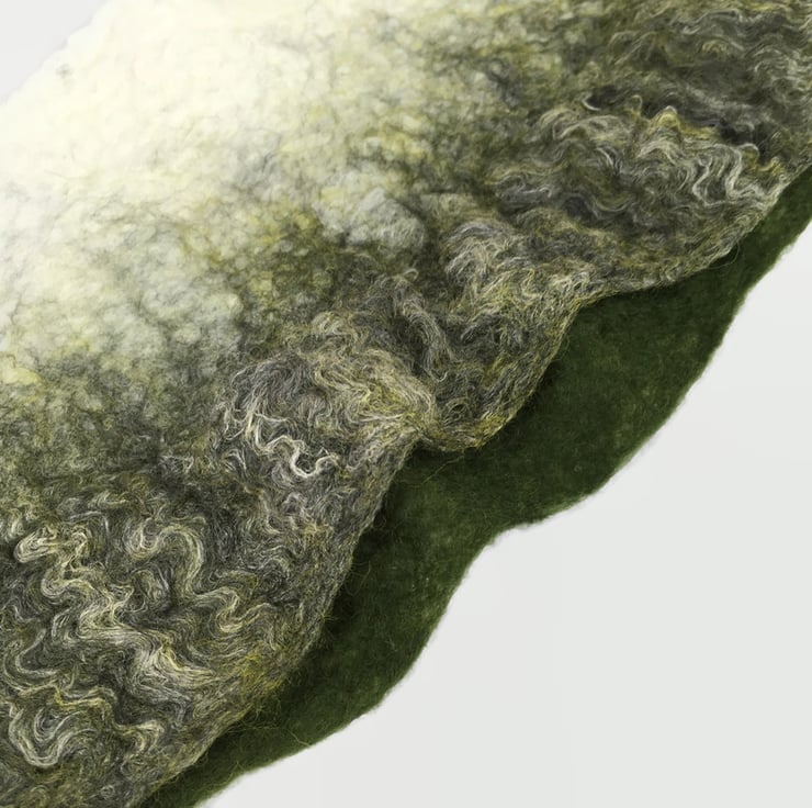 Nuno felting is a process in which the woollen fibres bind to the silk during felting trapping other fibres along the way.