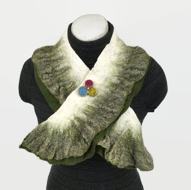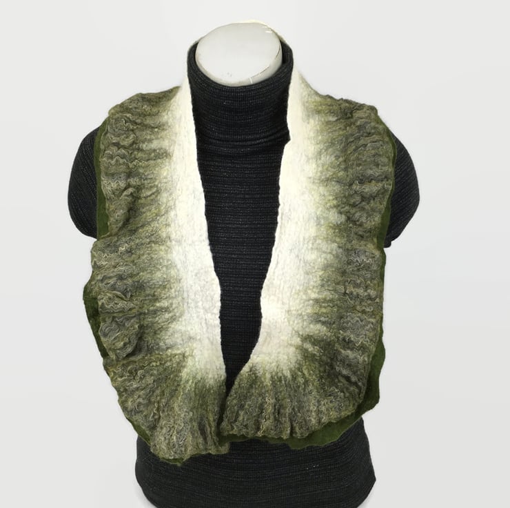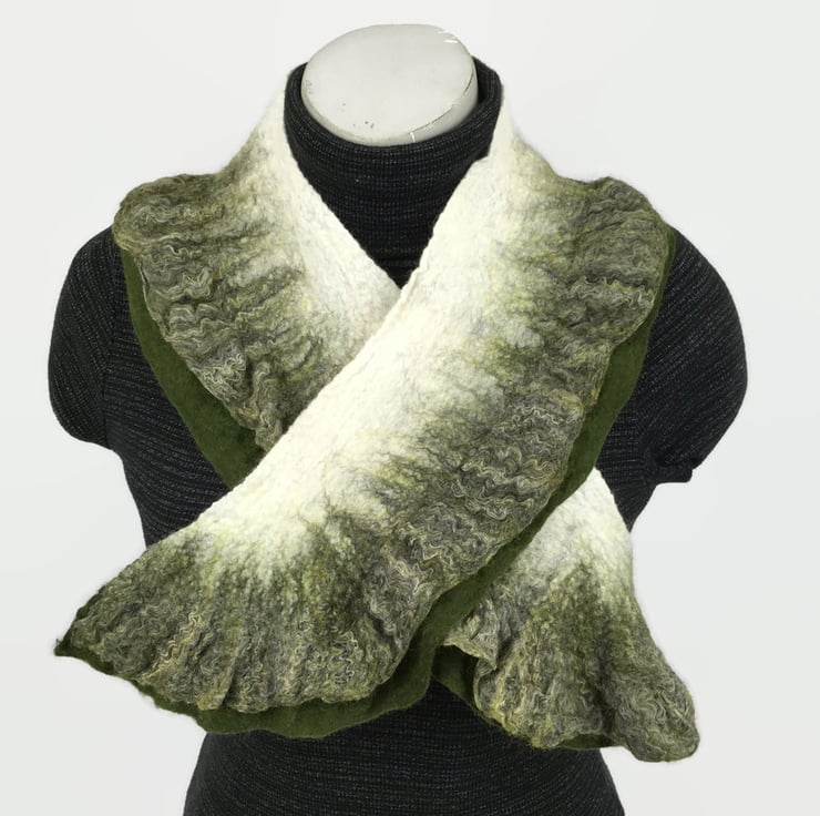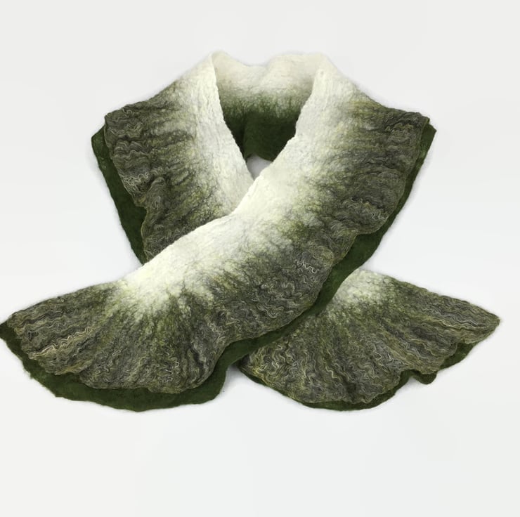 This pretty scarf has been made using a nuno felting process. Included in Seconds Sunday as a clearance/end of line item. Fine layers of white merino wool fibres have been nuno felted to a silk chiffon base fabric. Along one side a double slightly ruffled edge has been added, one layer being a solid green colour and the other being a blend of green, white and black wool, bamboo and soyabean fibres. The layout of the fibres in the border and manipulation during the felting process results in the ruffled effect. On the reverse of the scarf only the green border is visible.