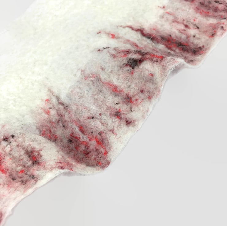 Nuno felting is a process in which the woollen fibres bind to the silk during felting.