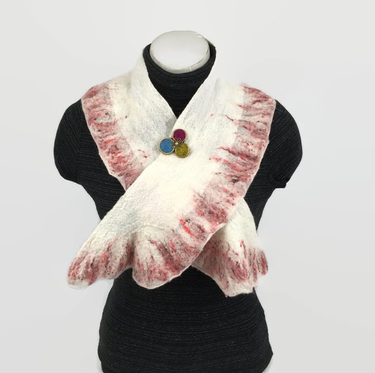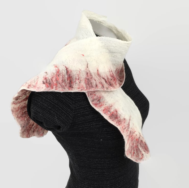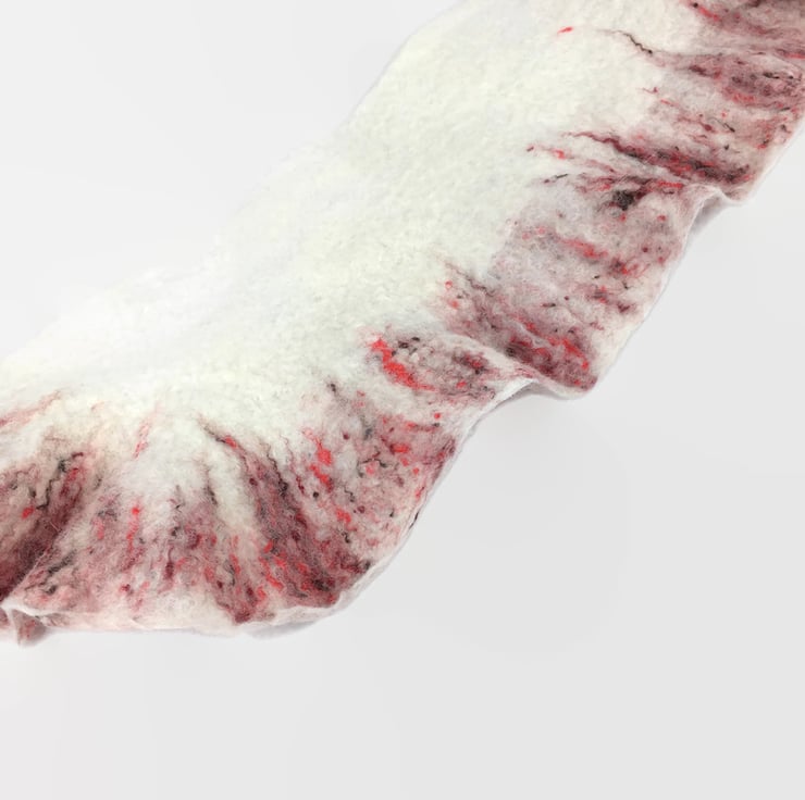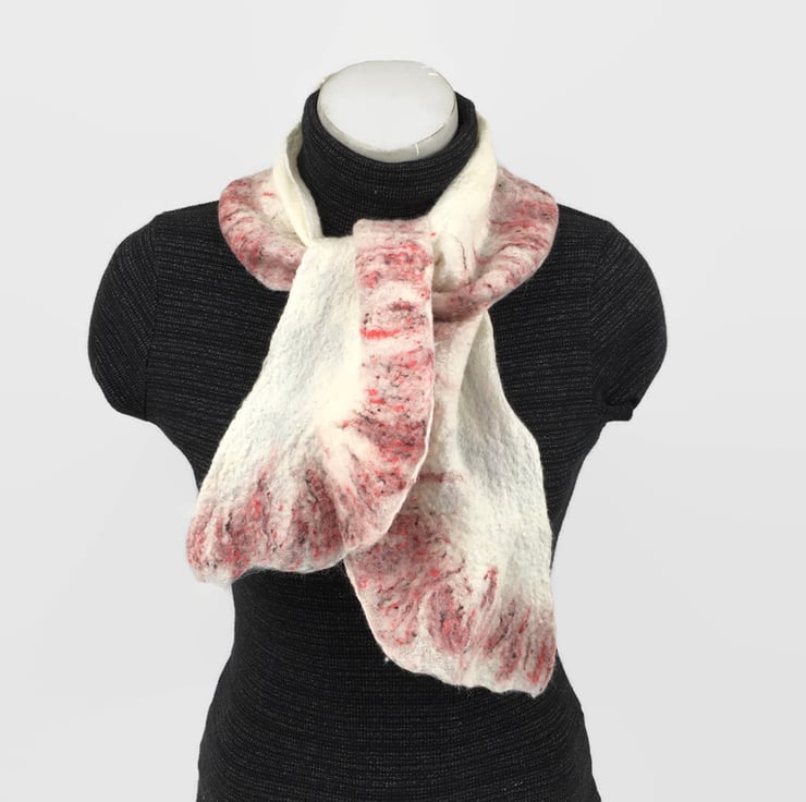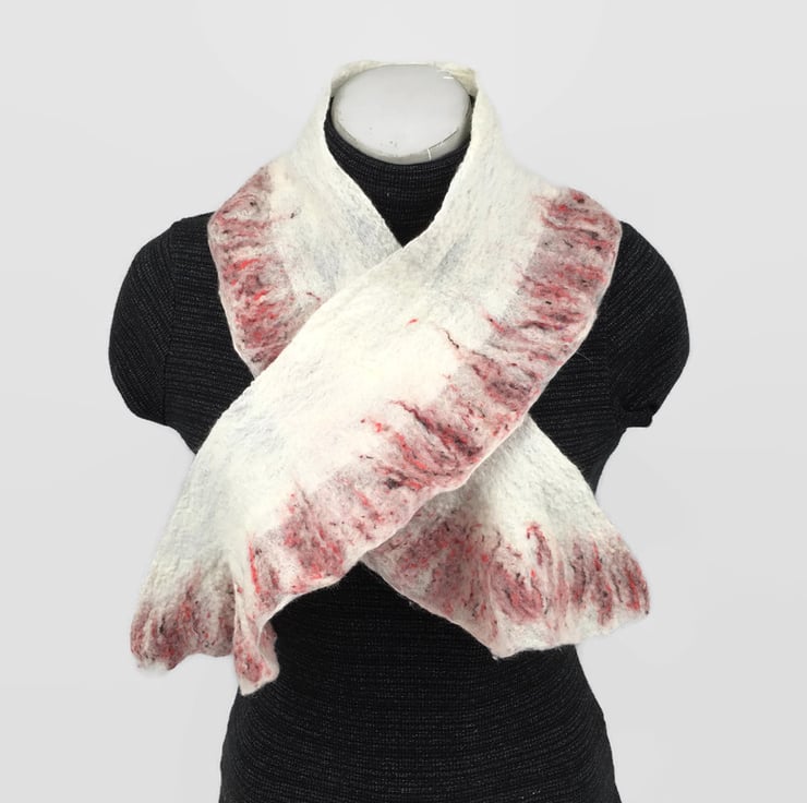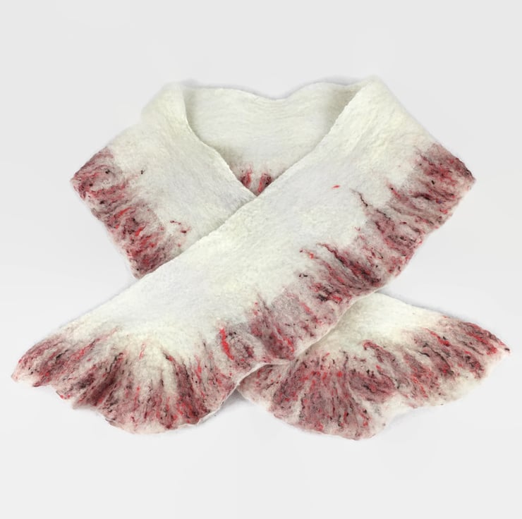 A beautiful shorter length scarf. Included in Seconds Sunday as a clearance/end of line item. White merino wool fibres have been nuno felted to a silk chiffon base and a blend of white merino wool and red silk fibres has been added to one edge to form a pretty border. The layout and manipulation of the border during felting has resulted in a slightly ruffled effect.