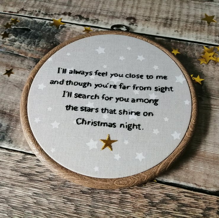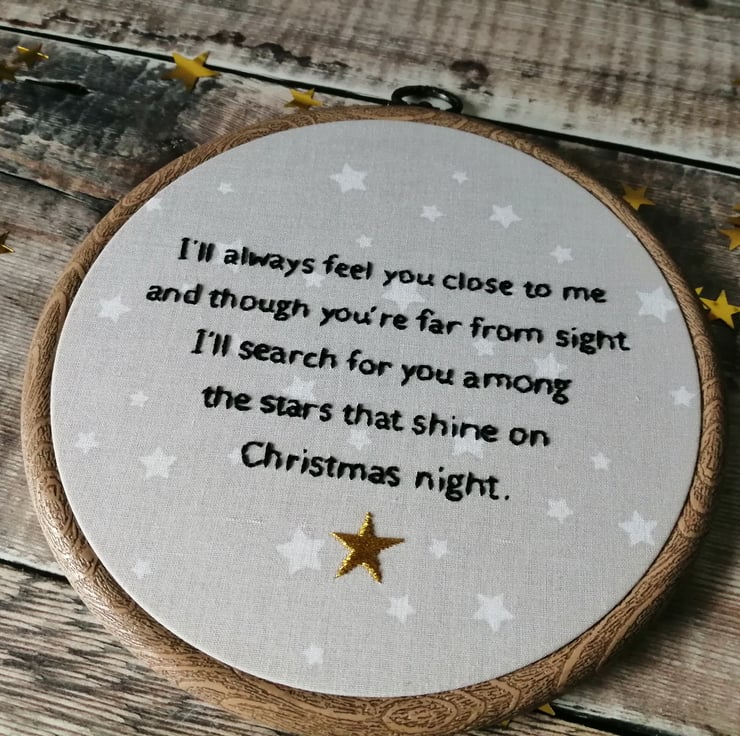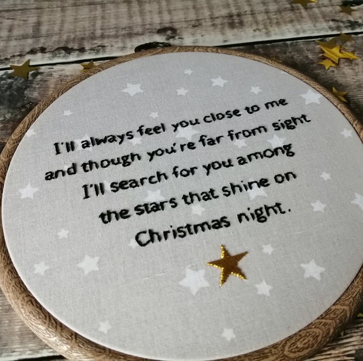 Christmas time can be particularly hard especially when a loved one is no longer around. My hand stitched memorial Christmas Star hoops are a beautiful way to honour their memories. These feature the quote which can be altered to suit you, personalised if needed and are hand sewn to order onto grey star fabric. They also feature a metallic gold star at the bottom and come set in a six inch hoop.