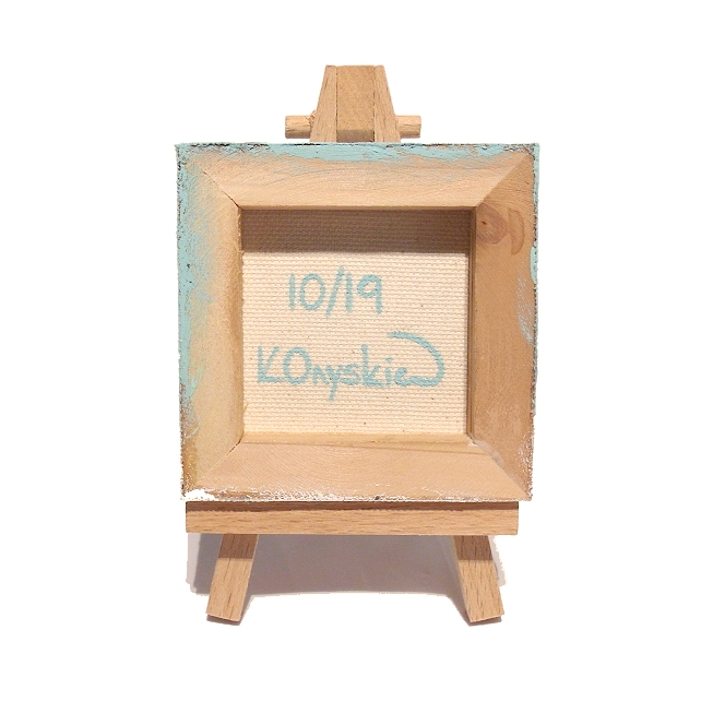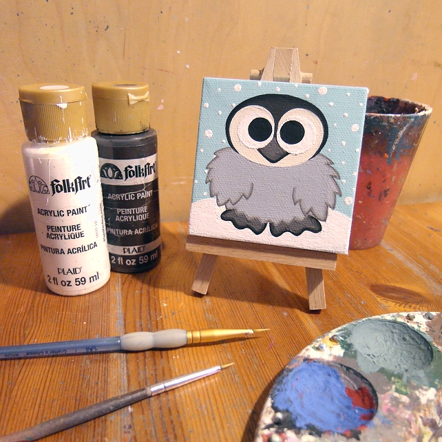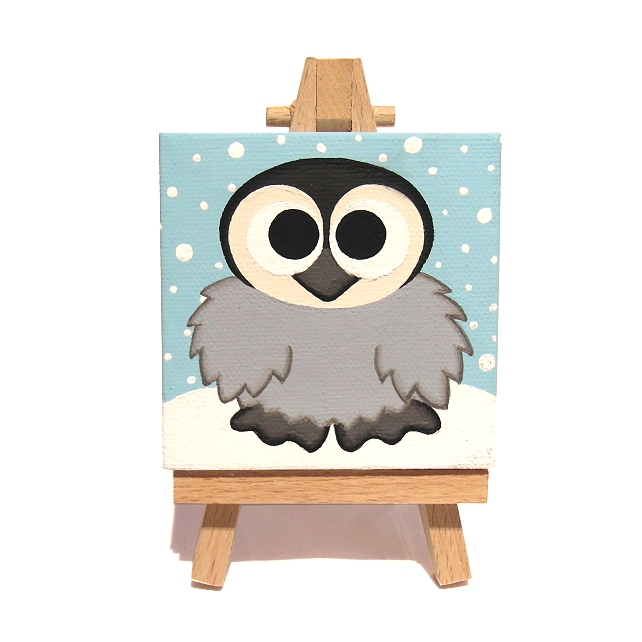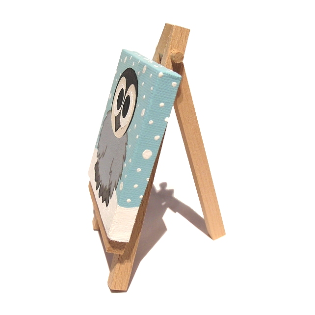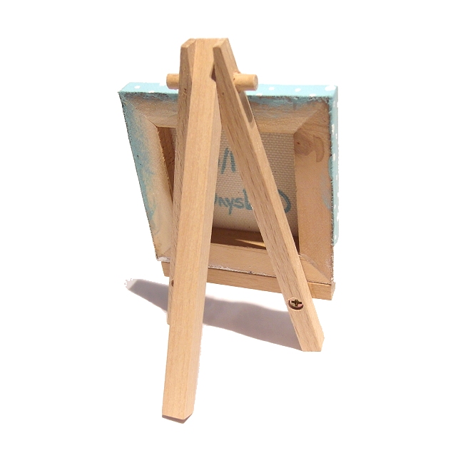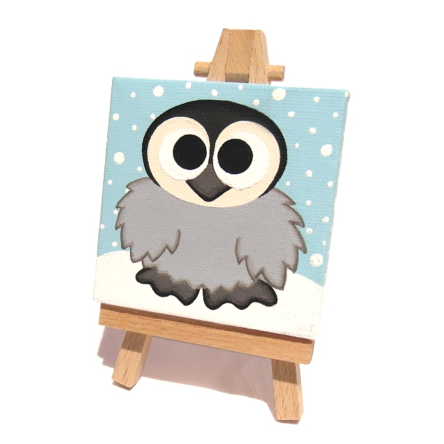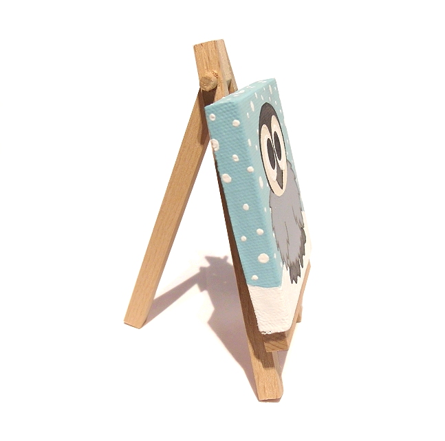 The penguin chick canvas will either come with a 12cm (4.7") wooden easel for display, or will be strung with a ribbon in a colour that matches the painting so it can be hung on a wall (as in picture 10). Just choose with easel or ribbon hanging when you buy.
