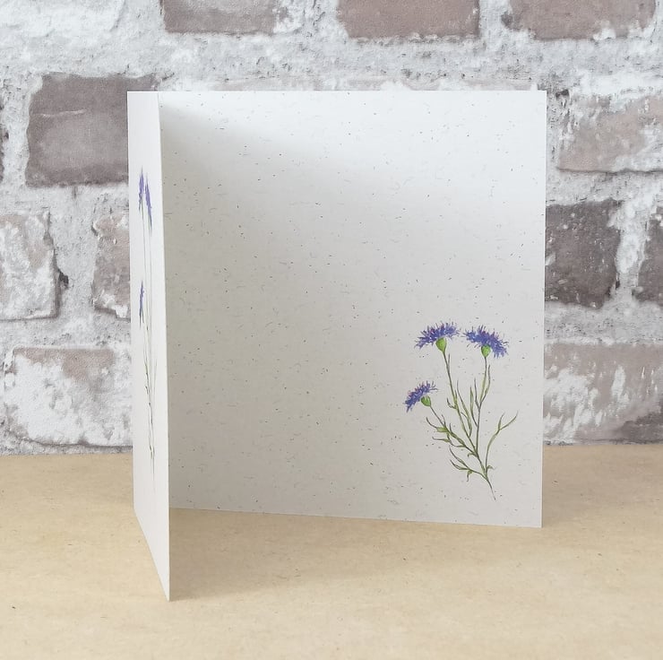 My eco friendly blank wildflower card has been printed with my Cornflower illustration on to 100% recycled oatmeal finish style 320g card, which has lovely naturally occurring flecks as shown in photographs above.