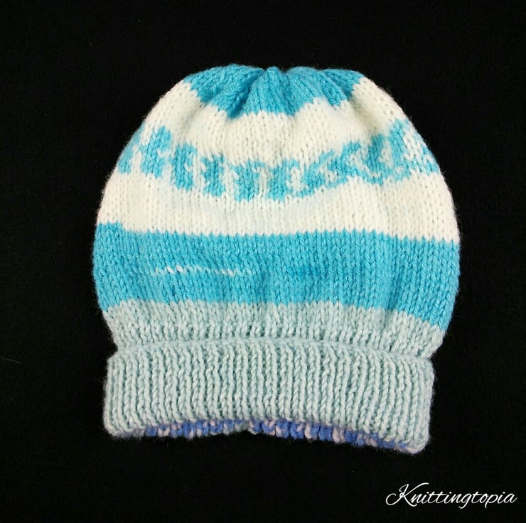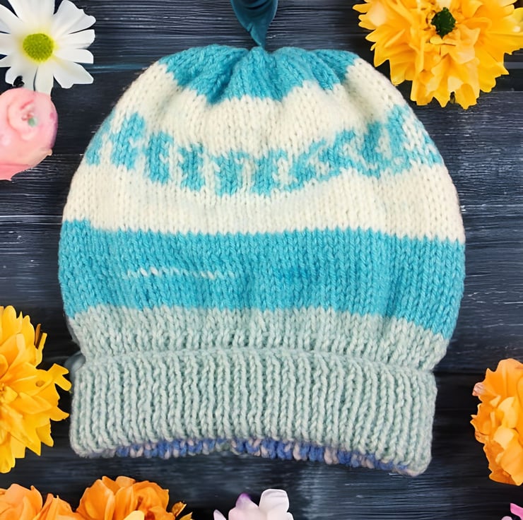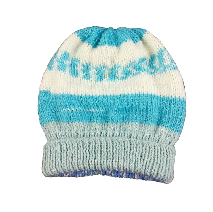 Charming Blue and Cream Hand-Knitted Baby Aran Hat, a delightful accessory designed to keep your little one cosy and stylish. This beanie hat is meticulously crafted using Aran weight yarn, ensuring that your baby stays snug and warm even during those chilly days. The yarn boasts a beautiful blend of blue and cream, creating a charming and versatile look.