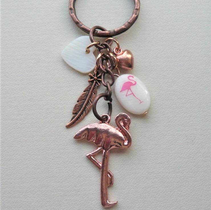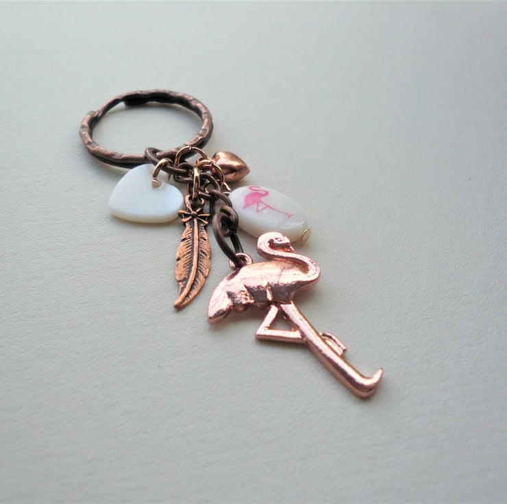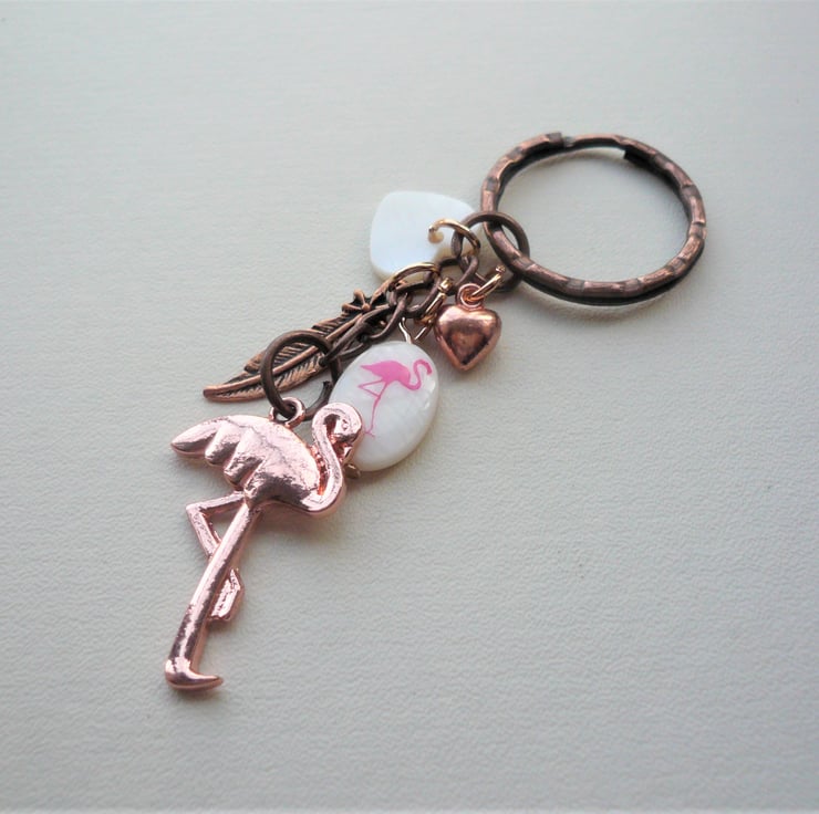 Pretty flamingo themed keyring or bag charm made up of 15mm long cream mother of pearl shell bead hand-stamped with pink flamingo, teamed with matching shell heart bead and red copper feather and rose gold heart charms and 30mm long rose gold flamingo pendant hanging below. All attached to 25mm redcopper keyring and chain measuring approx 8cm in length incl ring.