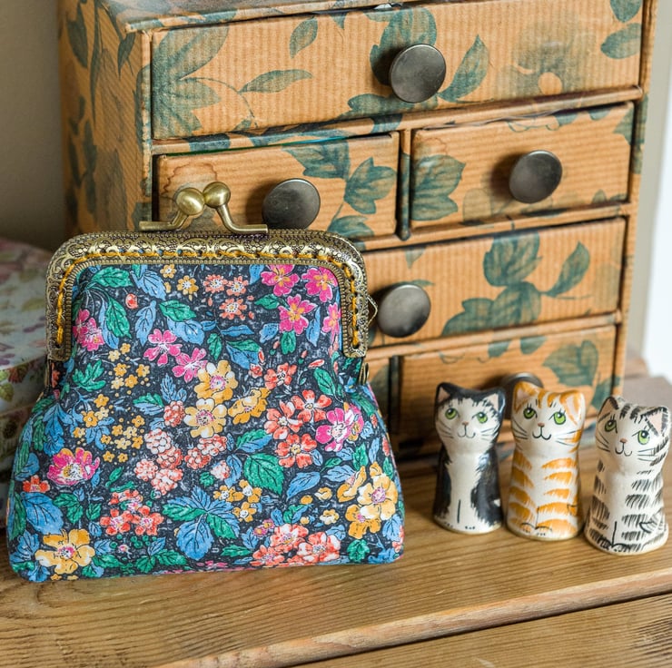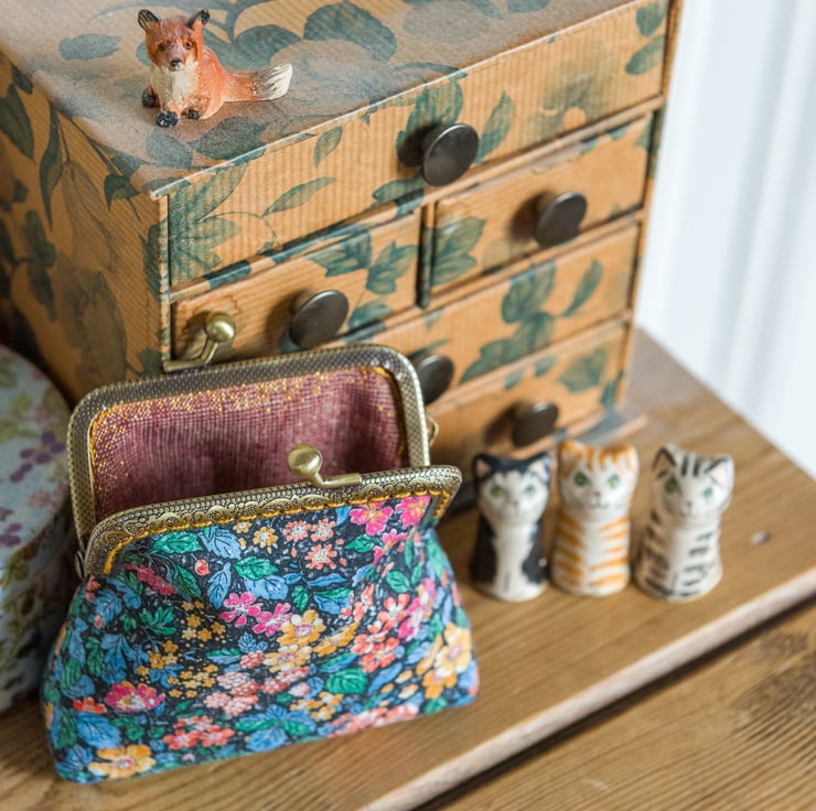 The purse outer and lining are interfaced with woven cotton for strength and I've added some soft fleece to the outer to give a puffy effect that feels nice in your hand. The fabric inside the purse is a sparkling copper coloured Essex Linen with metallic gold thread and the engraved metal frame of the purse is an antique bronze colour, which I hand stitch into place using a perle cotton to co-ordinate with the print.