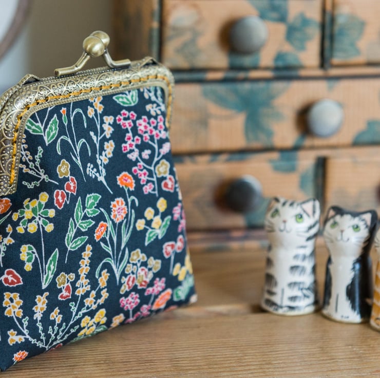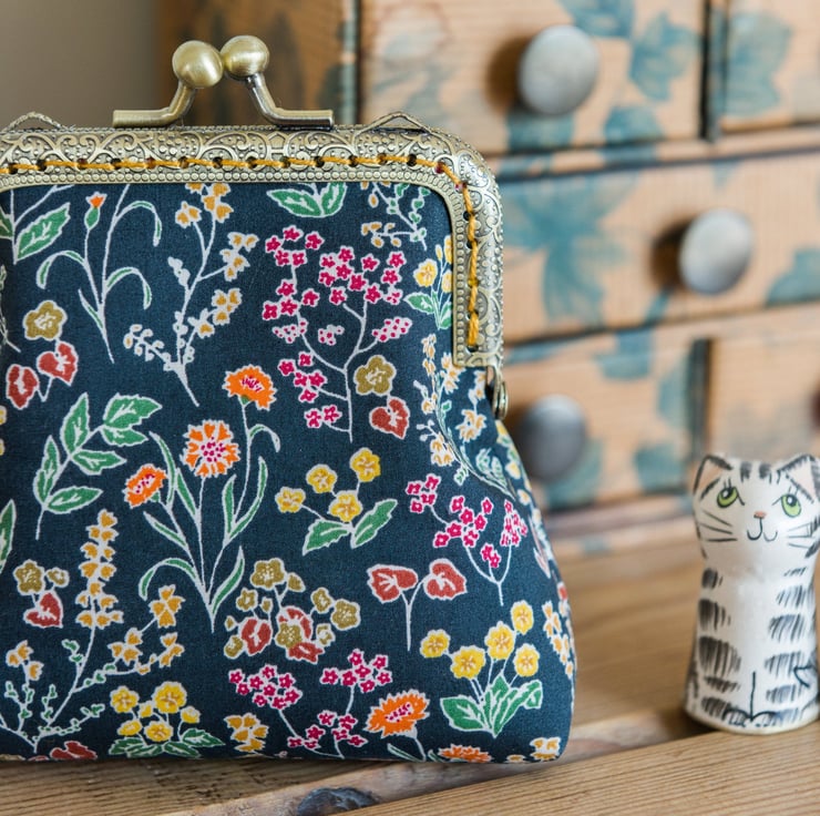 The engraved metal frame of the purse is an antique bronze colour and I've hand stitched it into place using a perle cotton to co-ordinate with the golden lining and the gold of the flowers in the print.