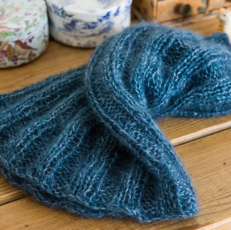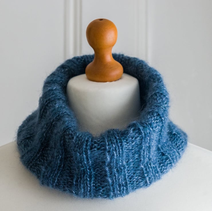 The colour of this piece is 'Alder', which is a mixture of pretty blue shades. The form that the cowl if modelled on here has a 38 inch (96.5cm bust) - to give you some idea of fit. I've cast on one edge using a really elastic method and the other was cast off on slightly larger needles, which means that you get maximum shapeability!