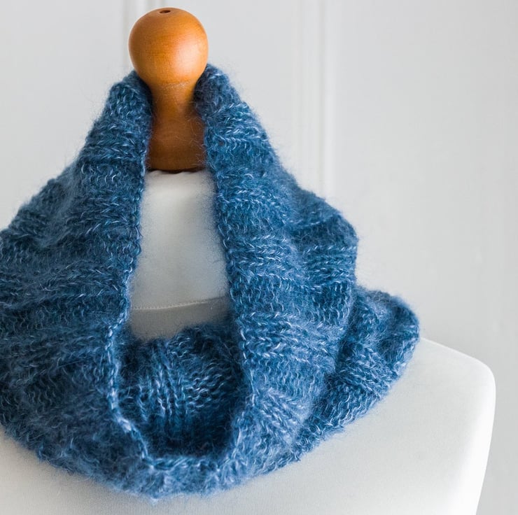 I've hand knit the cowl in Rowan's Kidsilk Haze Trio, which comprises three strands of Rowan's ever popular Kidsilk Haze spun together to make a beautiful soft and lightweight yarn. Trio offers all the softness of Kidsilk Haze in a heavier yet lightweight yarn with an amazingly soft handle and pretty mohair halo.
