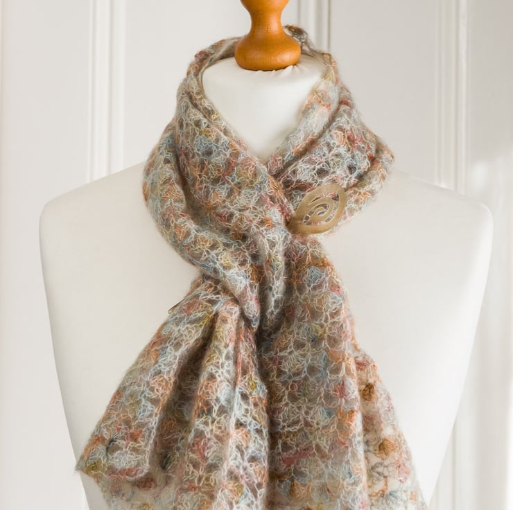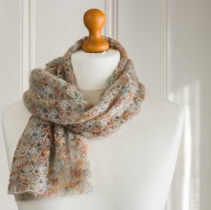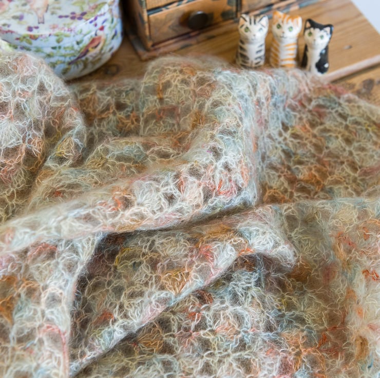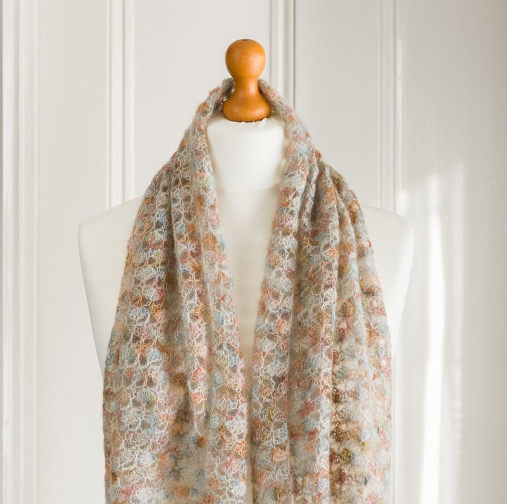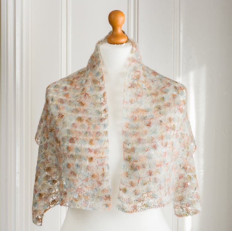 I've used a beautiful artisan dyed yarn called Floof to crochet this piece. The colour is called Blue Oyster and it is a pretty blend of blues, creams and beige with an odd speck of stronger colour from the hand dying process. The crochet stitch pattern I've used creates a rather structural lace fabric which is very light and airy, but the mohair and silk mix fibres of the yarn make it incredibly warm and soft to wear.