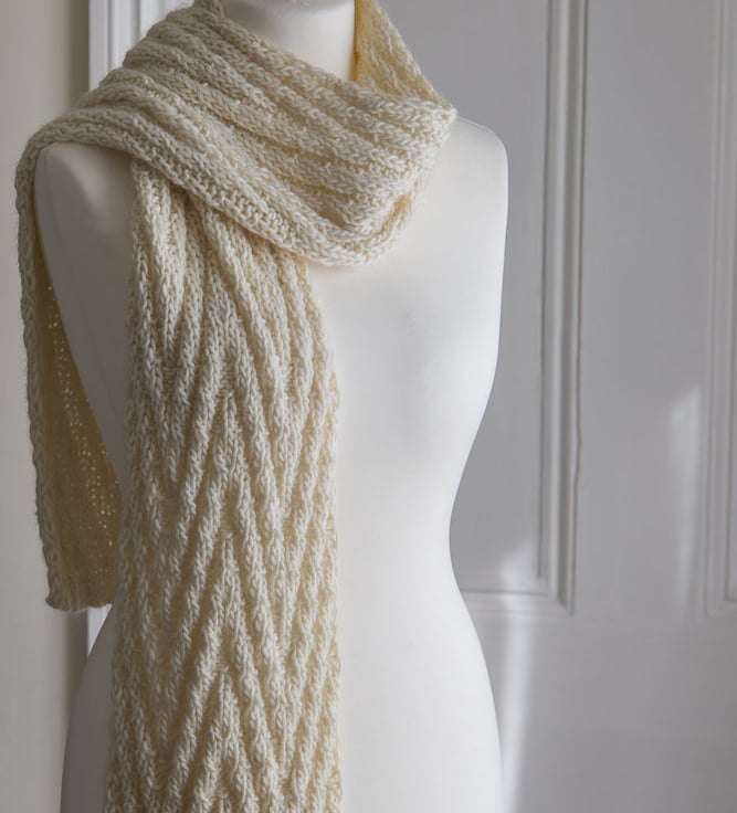 This scarf has a deep chevron pattern on both sides of the scarf. If is knit in Rowan's quite chunky Cocoon yarn, an 80/20 blend of Merino and Kid Mohair that does exactly what it says on the tin - cocoons you! It is very soft and lofty and the stitch pattern of this scarf works with that volume at the same time as shaping it into a pretty chevron pattern. The scarf is 176cm (69 inches) long and 20cm (7.9 inches) wide.
