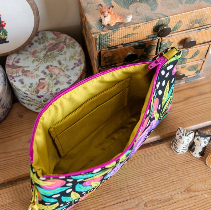 This purse is made with a super colourful print by Tula Pink called 'Monkey Wrench', featuring a playful monkey who has a wrench held in his tail. I've interfaced the outer and lining with woven cotton to give it struture and strength and added a soft fleece to the outer to protect the contents. The wristlet strap is made from the same fabric as the outer and the lining of the purse is made with a beautiful golden shot silk. I've added a 2 slot panel on one side of the lining, which is perfect for carrying a couple of credit cards, or anything you like of a similar size.