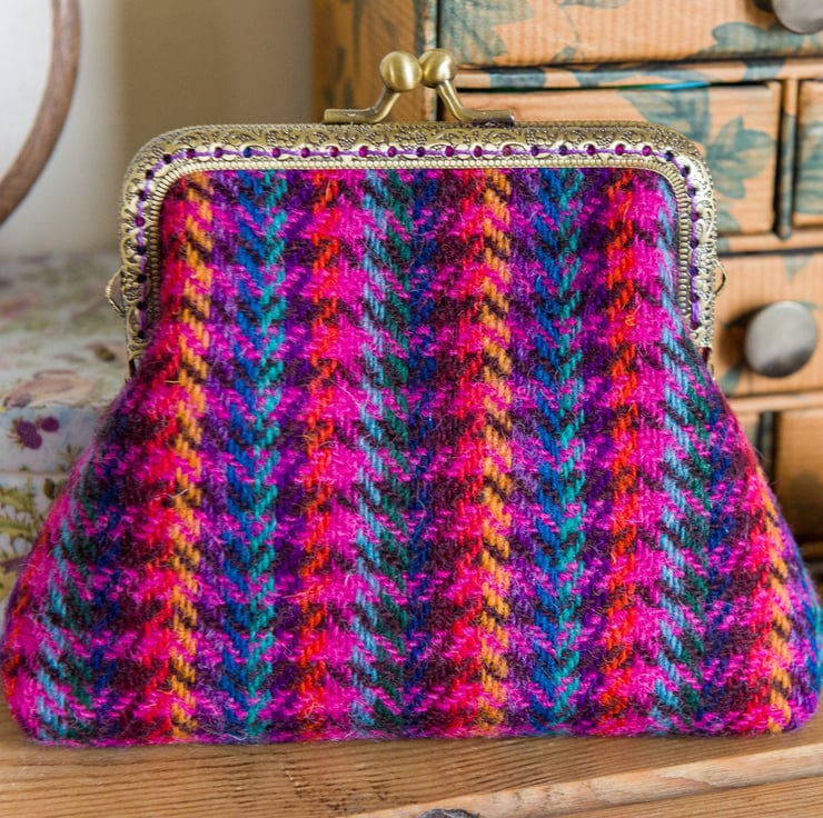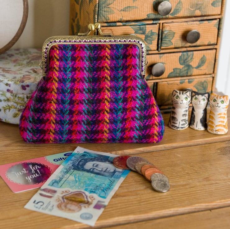 The purse is made from a lovely bright and super colourful checked Harris Tweed, woven in the herringbone pattern. The lining of the purse is a pure silk in an iridescent lilac colour and there's a small slip pocket on one side, perfectly credit card sized.