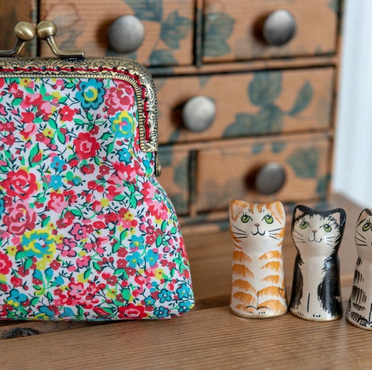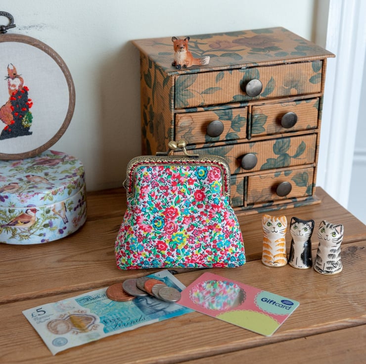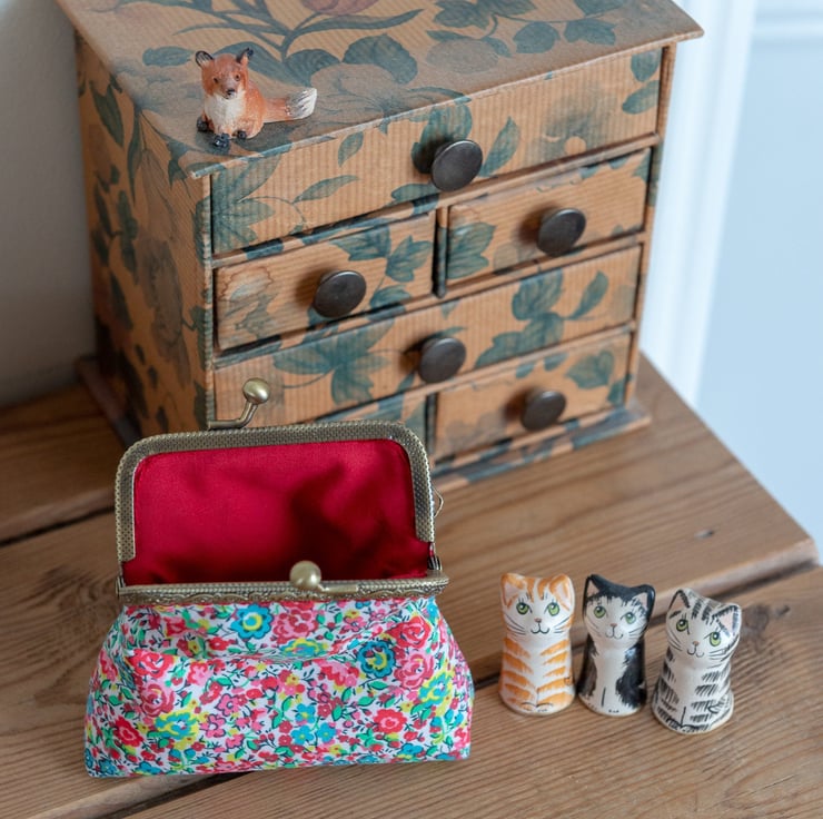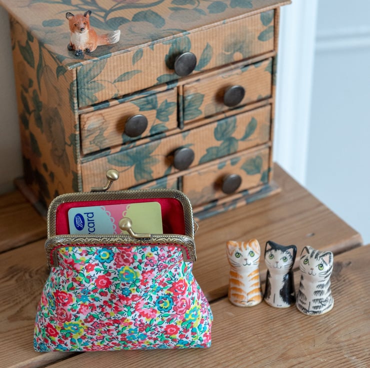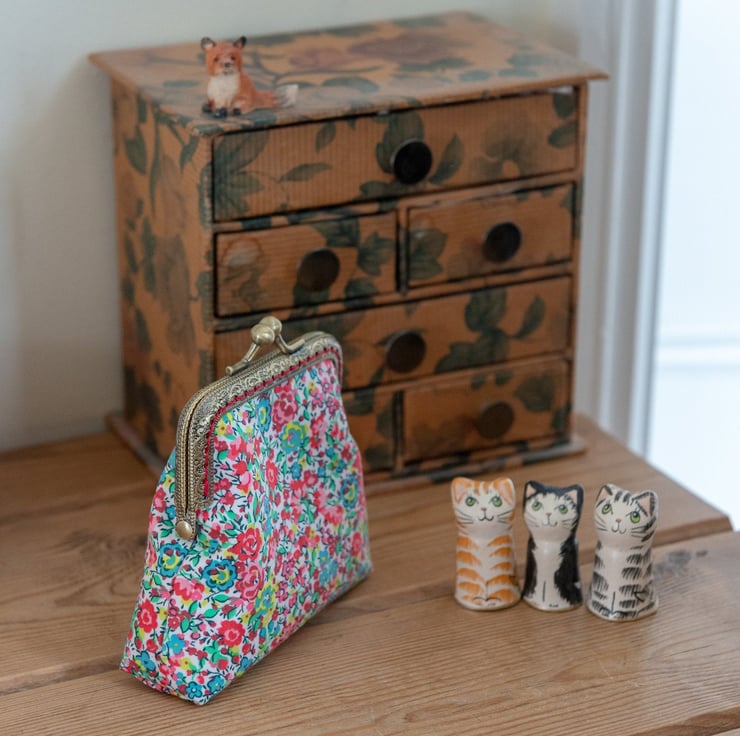 I've made the purse with a very pretty floral Liberty Tana Lawn print called 'Emma and Georgina', which was inspired by Liberty Fabrics' large collection of Victorian pattern books. The design was based on two tiny, dense floral prints: Emma was first produced on Tana Lawn in the 1970s; Georgina was launched in 2000.