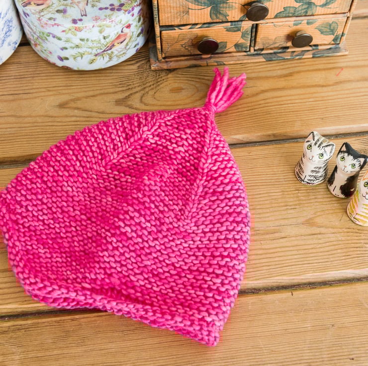 I've hand knit this cute little hat using a pure kettle dyed merino wool that is beautifully soft and warm and shouldn't irritate delicate skin as some itchy wools might. The colour is a pretty semi-solid shade called Shocking Pink and the hat is knit in the round, so is totally seamless, and therefore very comfy for baby. It also has a cute little tassel to ensure that nobody takes your baby pixie TOO seriously...