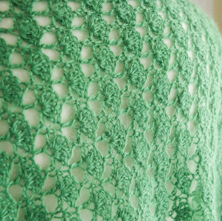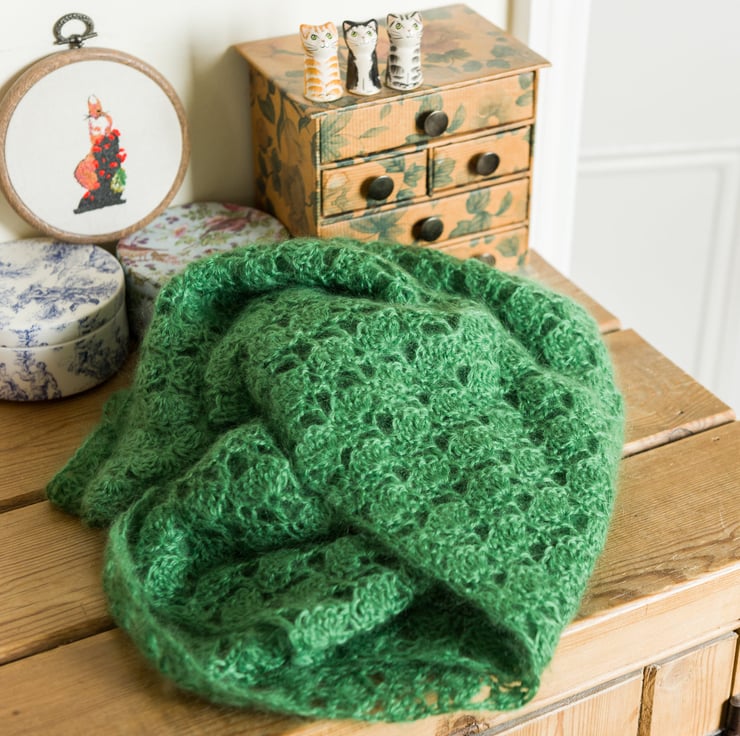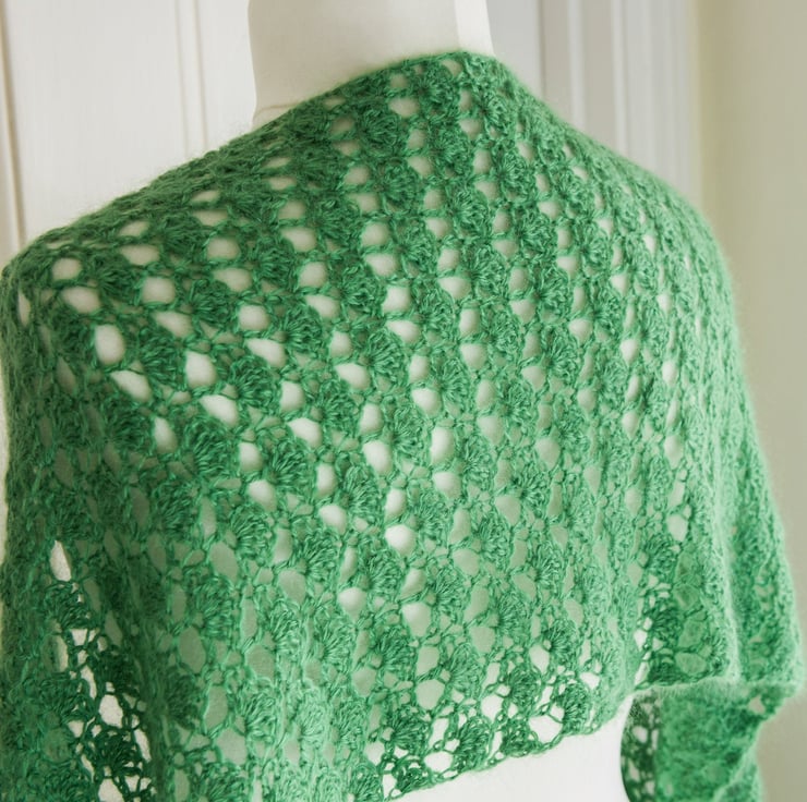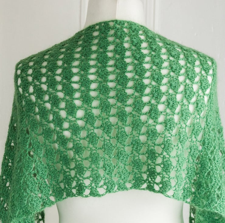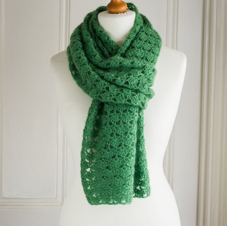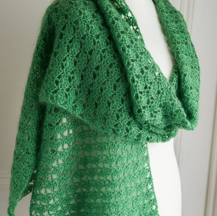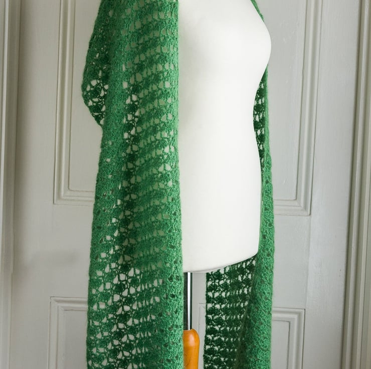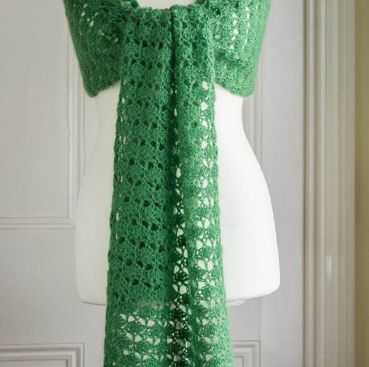This stole has been crocheted by me to my own design using a beautifully soft Mohair and wool 70 / 30 blend yarn in the freshest green shade. The design means that you can wear this piece in a number of ways: perhaps as a shoulder wrap over a pretty dress, or as a long and generously sized scarf under a winter coat. The crochet stitch I've used creates a lace fan pattern, which I think looks like mini trees - perfect for a yarn in this lovely green shade!