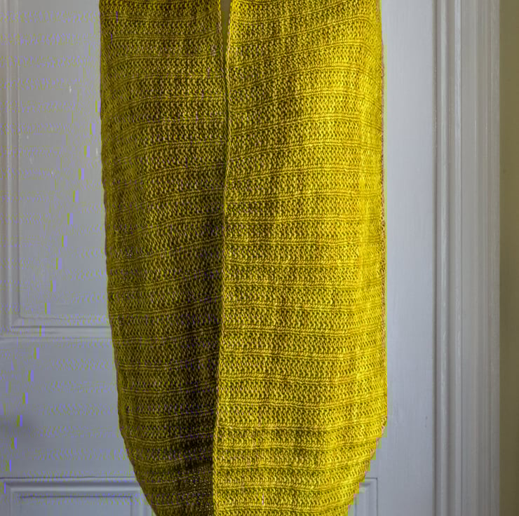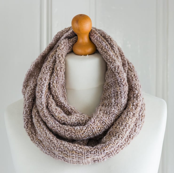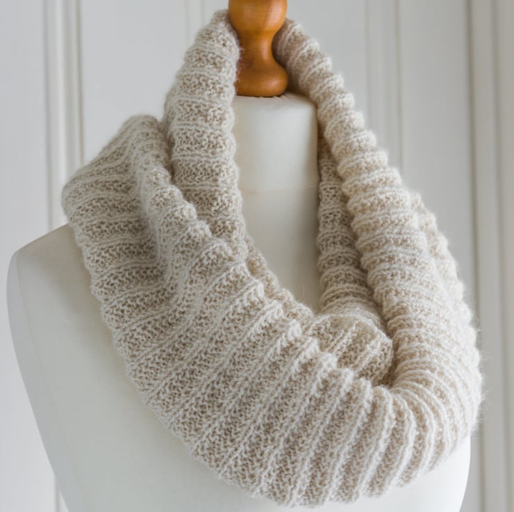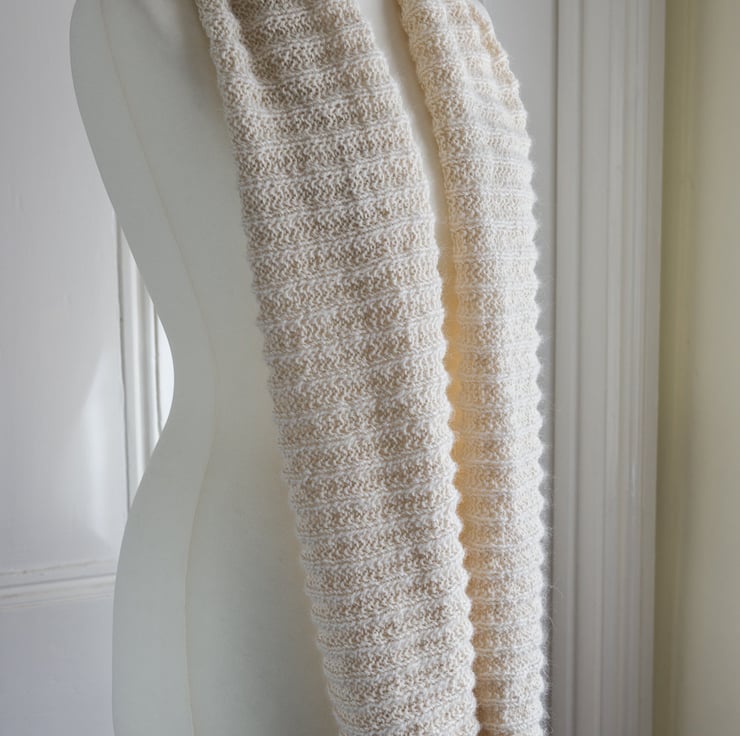 My original cowl, made with Malabrigos Worsted merino yarn, was satisfyingly quick to knit and I found the stitch pattern was one I could happily knit while watching television. I then had a fancy for a larger, natural coloured cowl, so made another version with undyed baby alpaca. The fine halo that alpaca yarn creates, adds a soft-focus effect, which suits the stitch pattern perfectly. I wondered how the stitch pattern would look in a finer gauge, so chose to make the supersized version in a DK weight yarn, which did take quite a bit longer to knit!