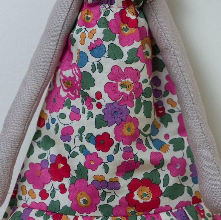 Standing 15.5 inches (40cm) tall, the Miss Foxes are machine stitched and hand finished using quality Tilda cotton and filled with high loft fire retardant polyester stuffing. Their faces are created with embroidery cotton, fabric paint and ink, and they all wear a Liberty Tana Lawn dress with a pleated hem and satin ribbon ruffle brooch. The dress is machine and hand stitched and the print used can vary depending on what is available at the time of making, but will always be Liberty Lawn in the character's colour.