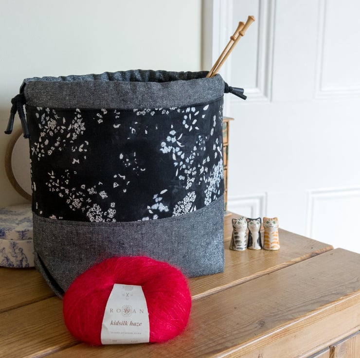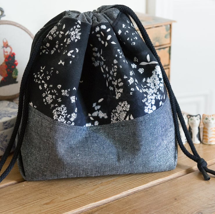 The feature fabric on this drawstring project bag is a beautiful monochrome linen fabric in a print called Lei Nani. It's from Nani Iro's exclusive Beau Yin Yang collection for Kokka fabrics. It has a ghostly black base decorated with cream flowers and pops of metallic silver overlaid - such a striking, modern look. I've partnered the print with a gorgeous midnight coloured Essex Linen with a sparkling silver metallic thread running through it.