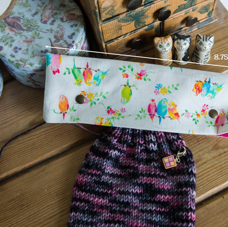 I offer the cosy in two sizes for 8" or 6" needles and another option to add a 3rd snap to the 8" size so that it can be used with circular needles, if magic loop is your thing. You can see how this works in the last 3 photos - essentially, you put your tips together into the left of the cosy, the cable sits to the right, above the right hand snap, and you push another loop of the cable around the extra snap to secure it.