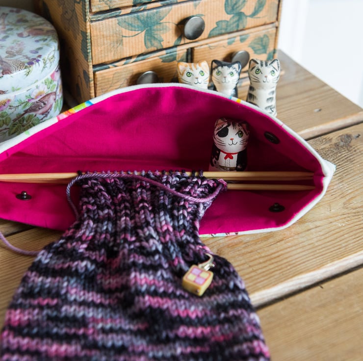 If you do a lot of sock knitting, you're probably very familiar with the idea of the dpn cosy, but many knitters (including me until recently!) don't know about these fabulous little holders for work in progress on double points. I used to squish up my knitting on the needles and then drop it into a project bag where I could accidentally knock some of the stitches off the needles or, get everything tangled up in yarn or other things I had in the bag - very irritating. With these holders, your needles and stitches are safely tucked away until you open the holder to take them out and restart your knitting.