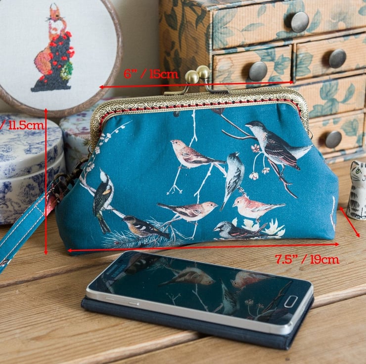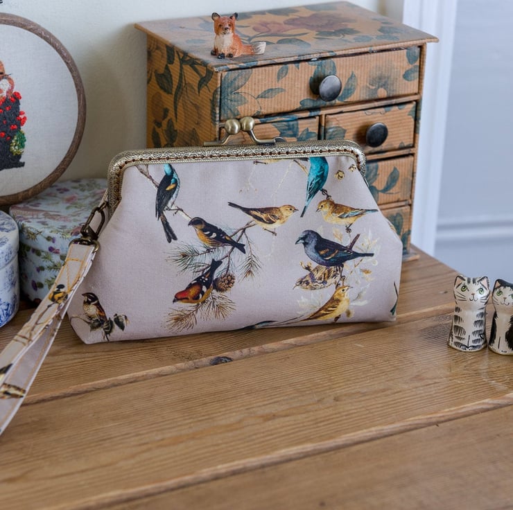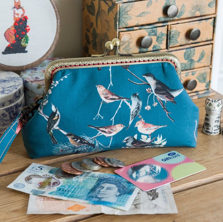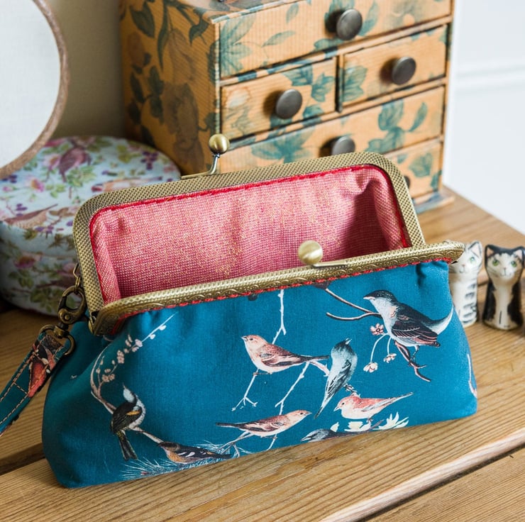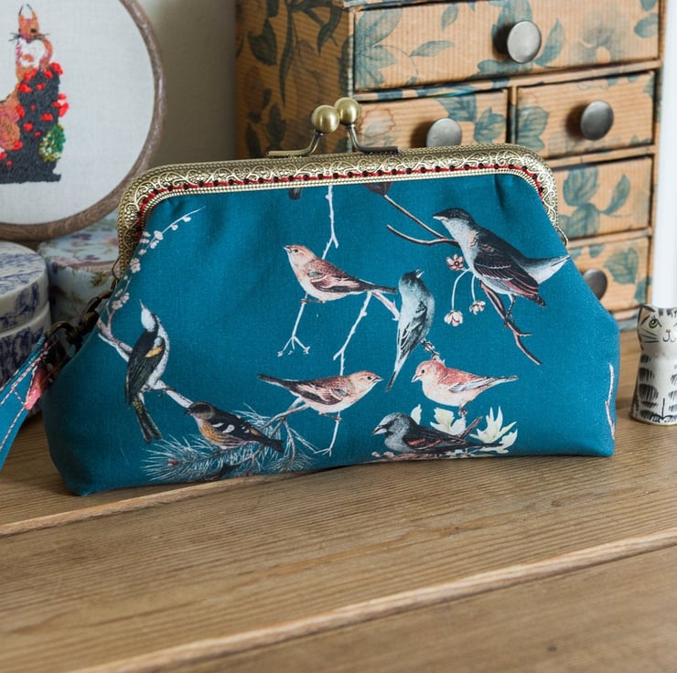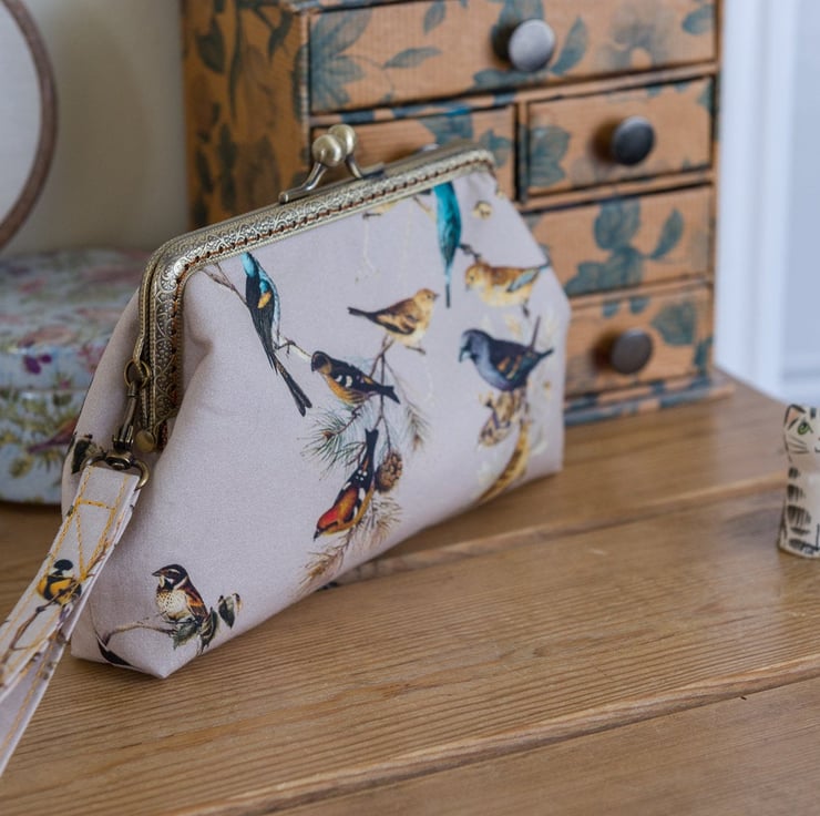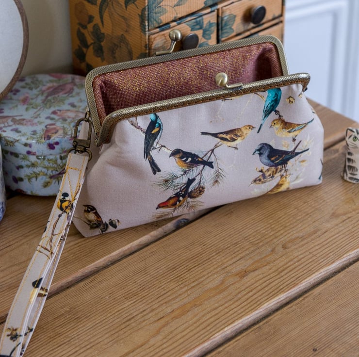 The purse has been made with a lovely cotton lawn digital print, which features lots of realistic looking birds on a choice of two background shades - a dark teal or a beige. I've interfaced the lawn with a few layers of woven cotton to give it strength and added a soft fleece to give structure and to protect the contents. The wristlet strap is made from the same fabric as the outer and the lining of the purse is made with an Essex Linen with gold metallic threads running through it. The teal bag has a coral coloured lining and the beige is a rich copper shade. I've also interfaced the lining with woven cotton to ensure longevity and add more structure to the bag overall.