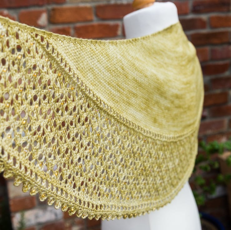 I've hand knit the shawl in a crescent shape, with a deep lace knit section, which is scattered with 300 plus triangular shaped crystal beads that have a honey coloured inner and catch the light beautifully. Each of the 105 picots at the bottom edge of the shawl have a bead set into them too. The yarn I've used is a luxury fibre, hand dyed in small batches by an artisan dyer based in Berkshire, England.