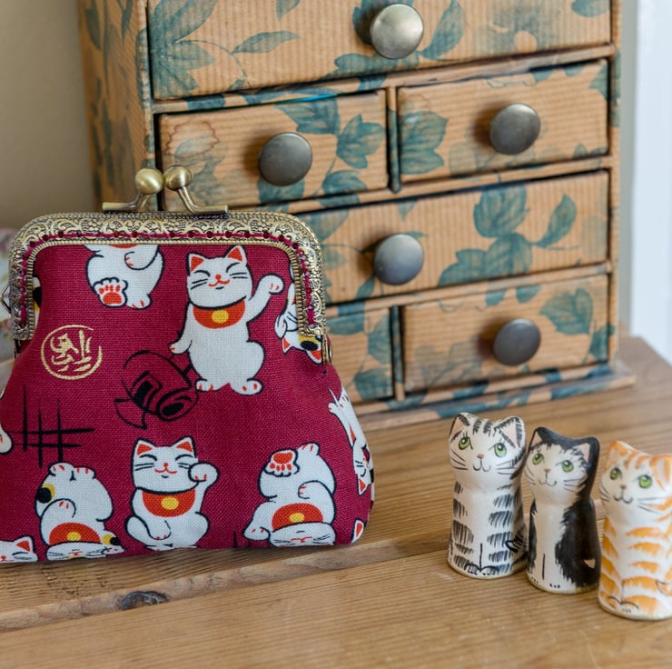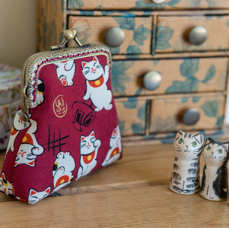 I've made the purse with a cute and fun Chinese lucky cats print in a rich shade of red, with golden highlights. I've interfaced the outside of the purse for strength and then lined it with some soft fleece to give a puffy effect that feels nice in your hand. The inside of the purse is lined with a red and metallic gold woven linen and cotton blend fabric to add another layer of lucky red and the blessing of your purse always being full of gold - one way or another!