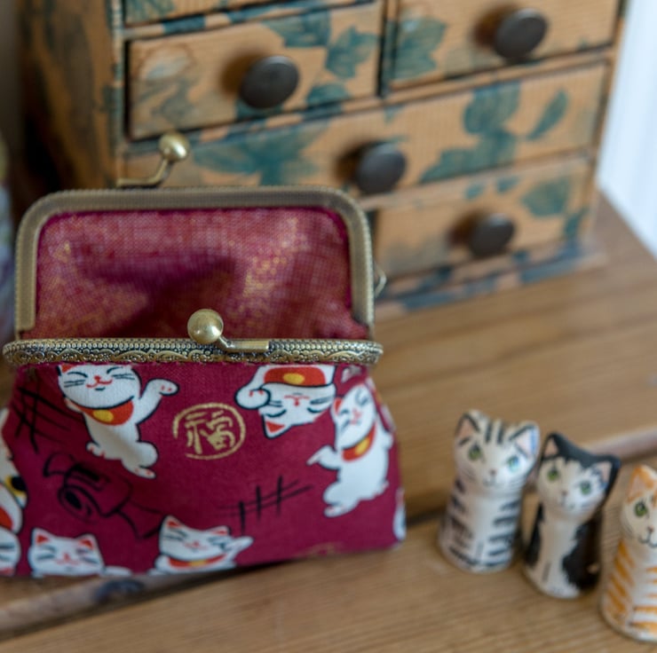 Coin purse featuring Chinese lucky cats in red and gold, with metallic lining