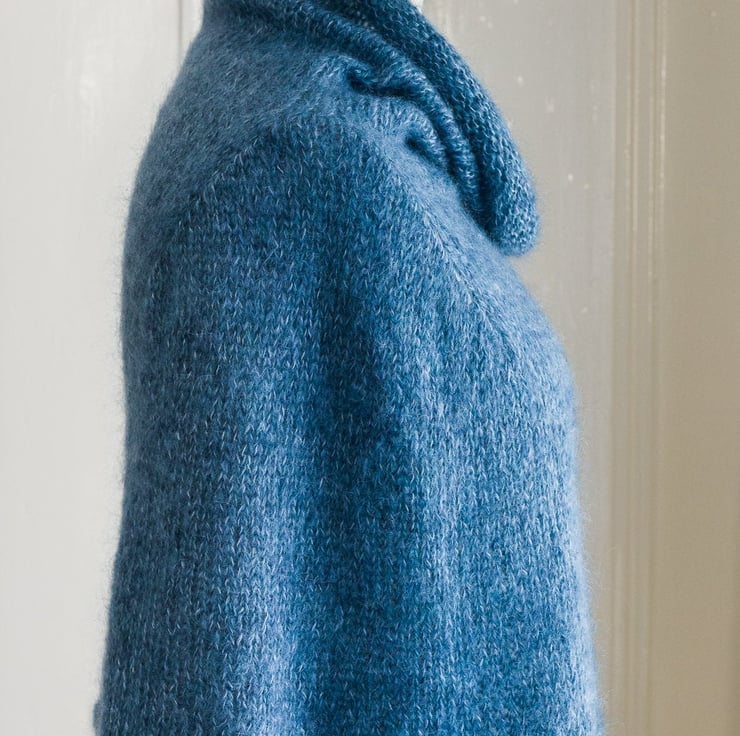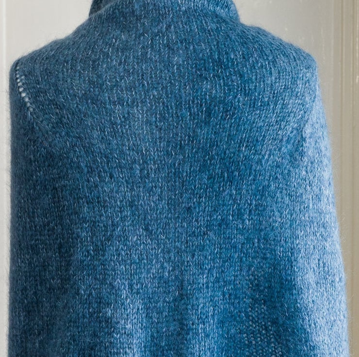 The colour of this piece is 'Alder', which is a mix of rich blue, a green blue and pale cream. I've created shaping around the shoulders so that it sits happily over your arms but still gives you room to move them. The form that the cape if modelled on here has a 38 inch (96.5cm bust) - to give you some idea of fit - this cape would be perfect for a UK size 12 dress size.